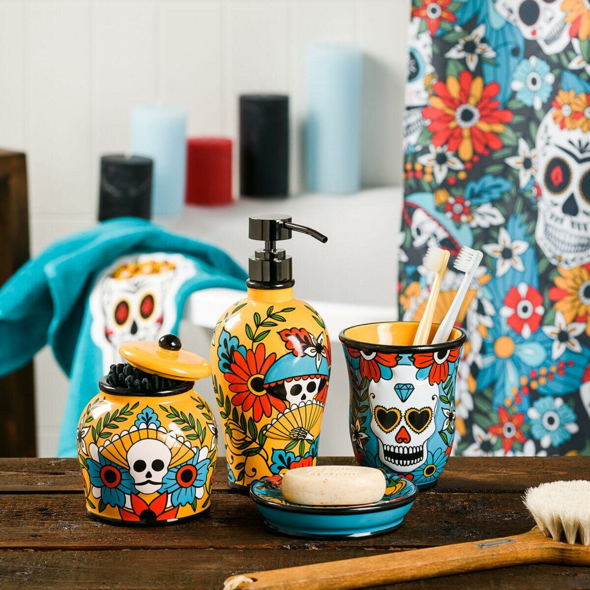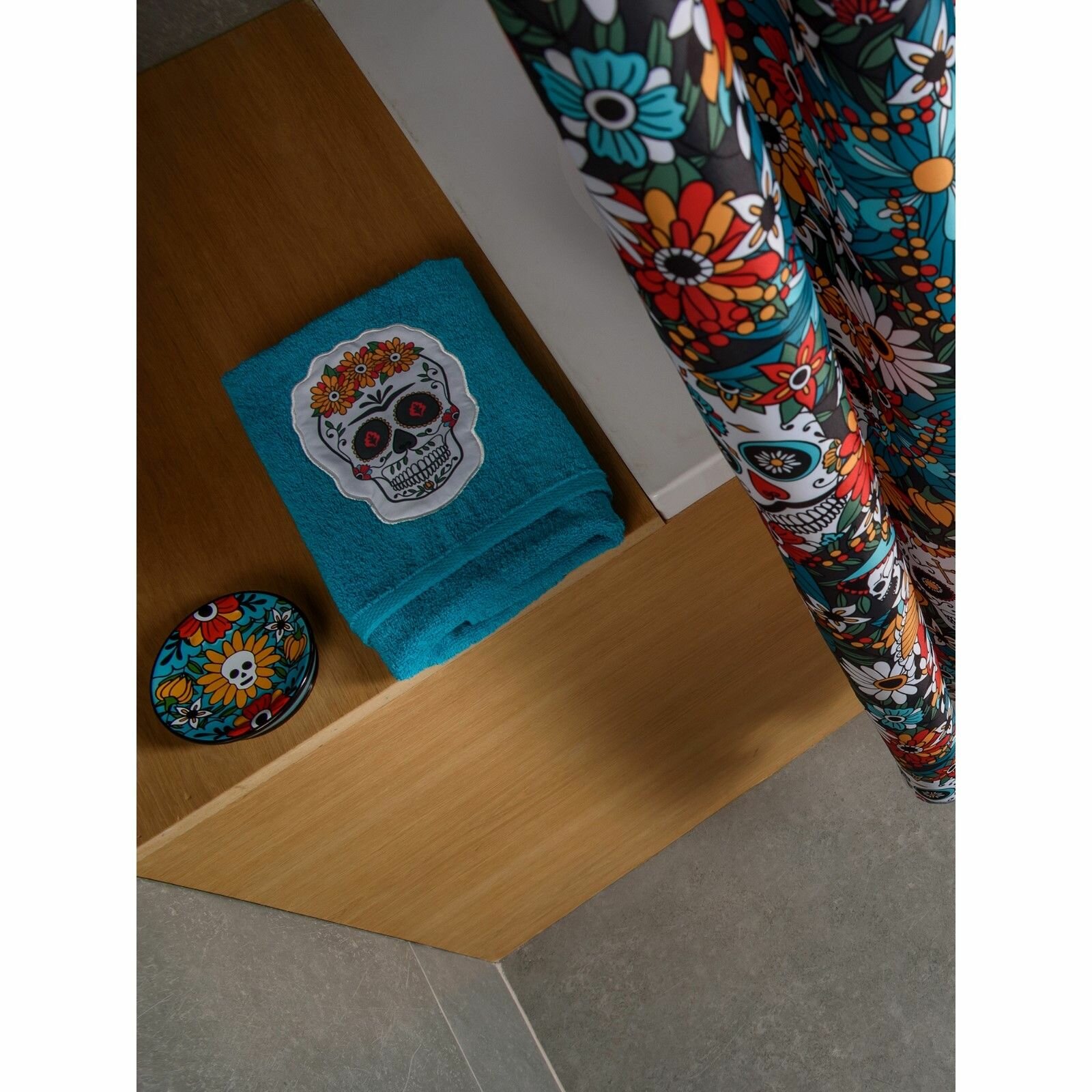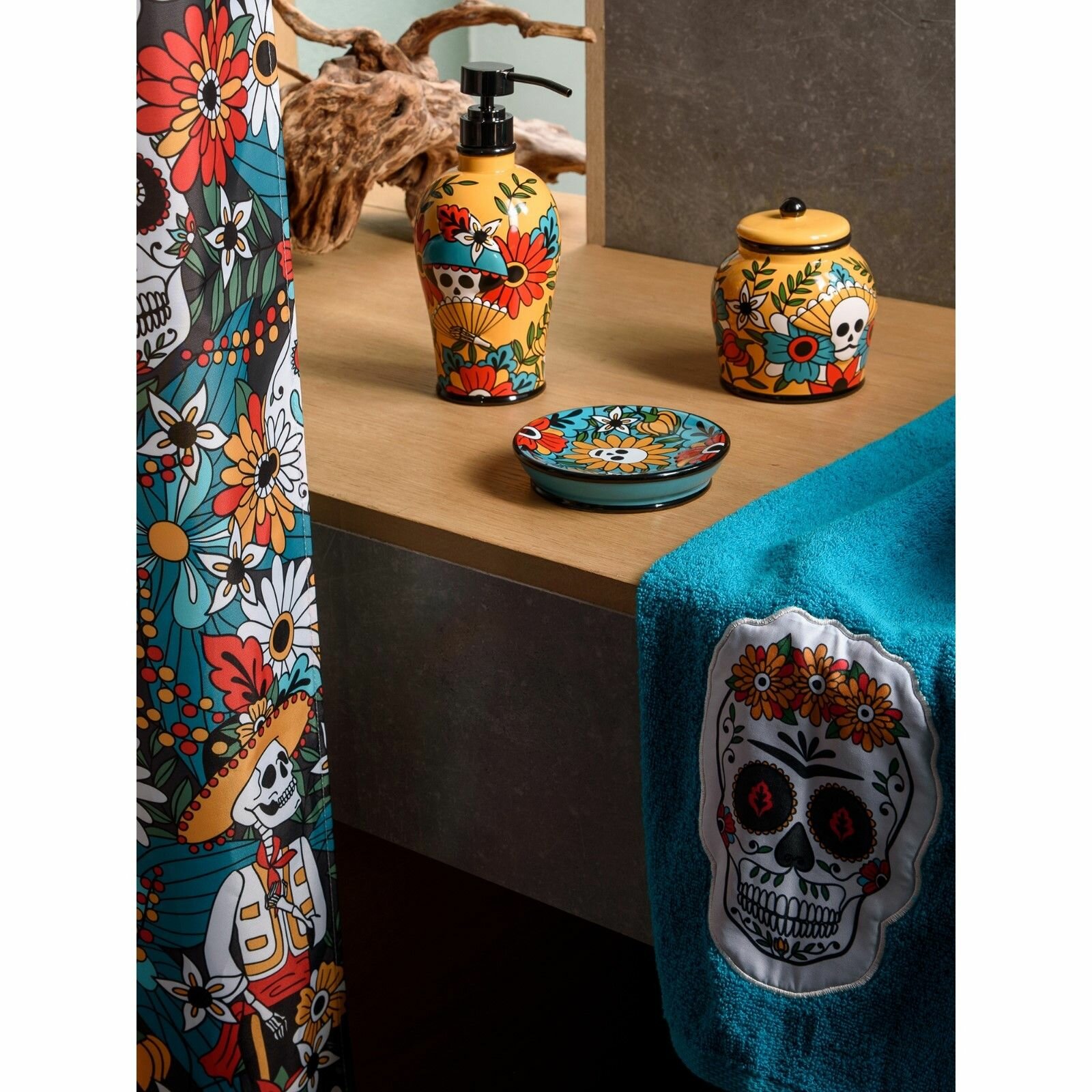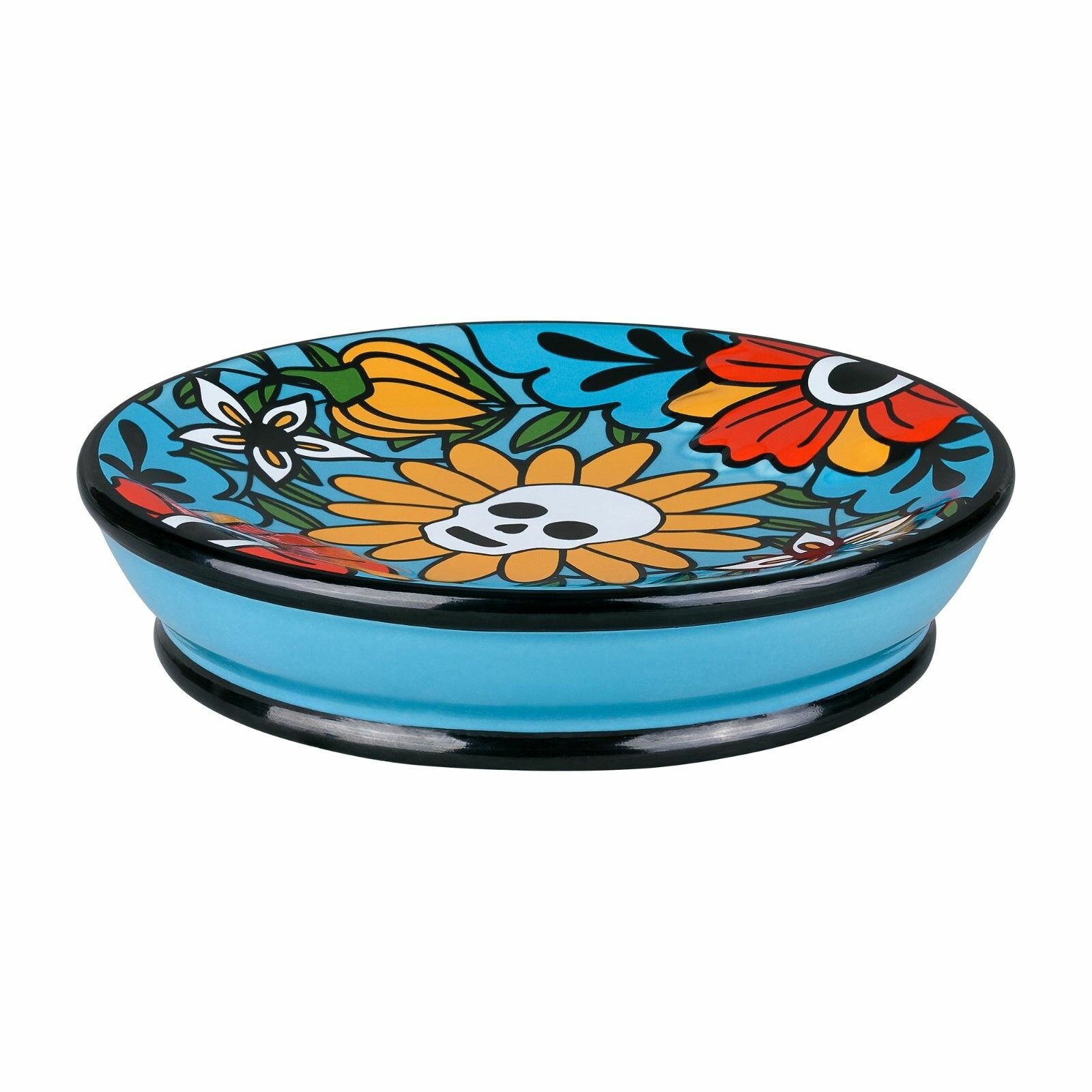 Круглая бирюзовая мыльница Los Muertos 12х2,5х12см создана по мотивам мексиканского праздника День Мёртвых. Калавера (череп) - символ дня, когда живые могут почтить усопших песнями, плясками и весёлыми историями. Этот дух любви к жизни мы решили передать через яркие образы и цвета. Керамическая мыльница покрыта глянцевой глазурью, которая защищает принт от выцветания и вымывания. Объёмный рисунок добавляет мыльнице тактильности и не позволяет мылу скользить по поверхности. Принт выполнен при помощи технологии печатной деколи. Круглая мыльница с черепами Los Muertos является частью коллекции, в которую также входят дозатор, ёршик, стакан, штора, полотенца для тела и рук, а также коврики.