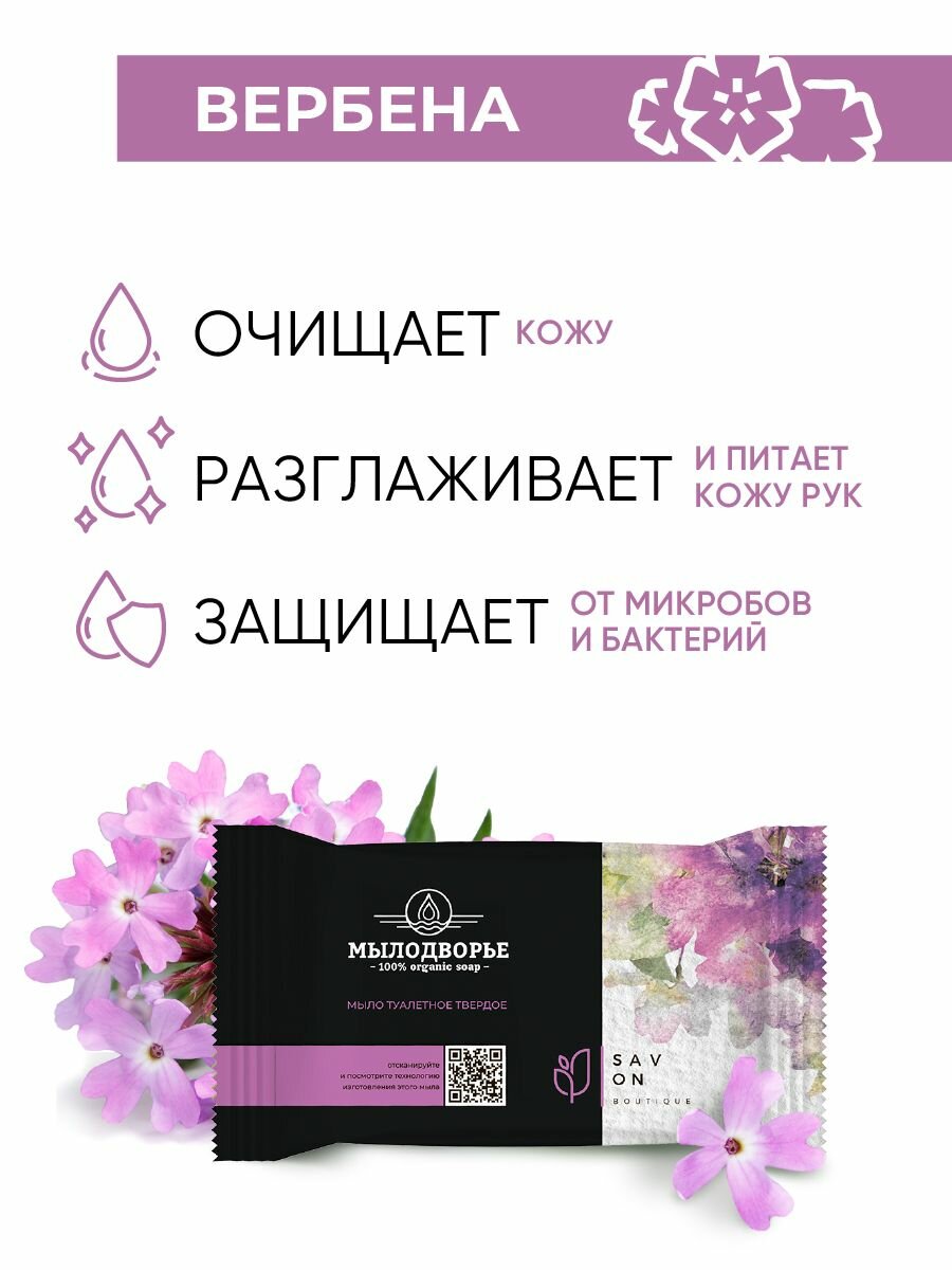 Мыло туалетное 90 гр. «Мылодворье» сочетают в себе лучшие традиции русского мыловарения и передовые технологии. В составе мыла 80 % натуральных органических компонентов, среди которых масла и экстракты лекарственных растений, ароматические травы и экзотические цветы. Наша компания использует многоступенчатую систему проверки качества продукции и сырья в собственных лабораториях. Мыло туалетное твердое Вербена обладает противовоспалительными и антимикробными свойствами, разглаживает и питает кожу. Ее аромат благотоворно влияет на нервную систему, снимает усталость.
