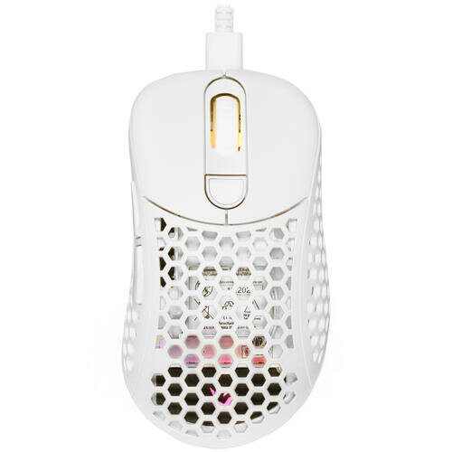 Легкая конструкция мыши весит всего 75 г благодаря стильной перфорации корпуса, а многоцветная подсветка добавляет оригинальности. Модель разработана для удобного хватания правой рукой.