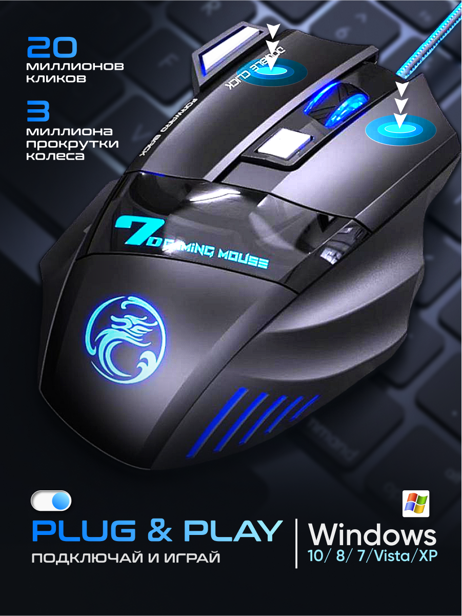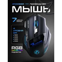 Игровая мышь проводная бесшумная с подсветкой RGB, 2.4 G, DPI 3200, 7 кнопок, мышка совместима с любыми OS системами, длина кабеля 1.7 метра, черный