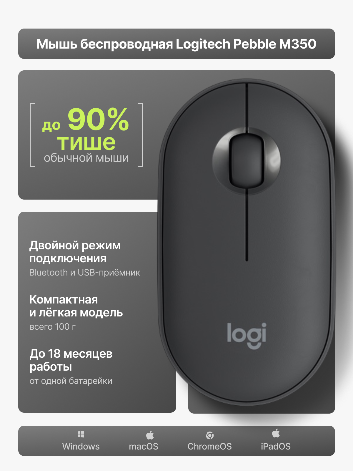 Купить Мышь Logitech Pebble M350, беспроводная, бесшумная, оптическая, графит с доставкой по всей России.