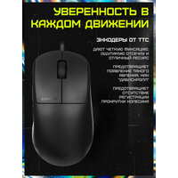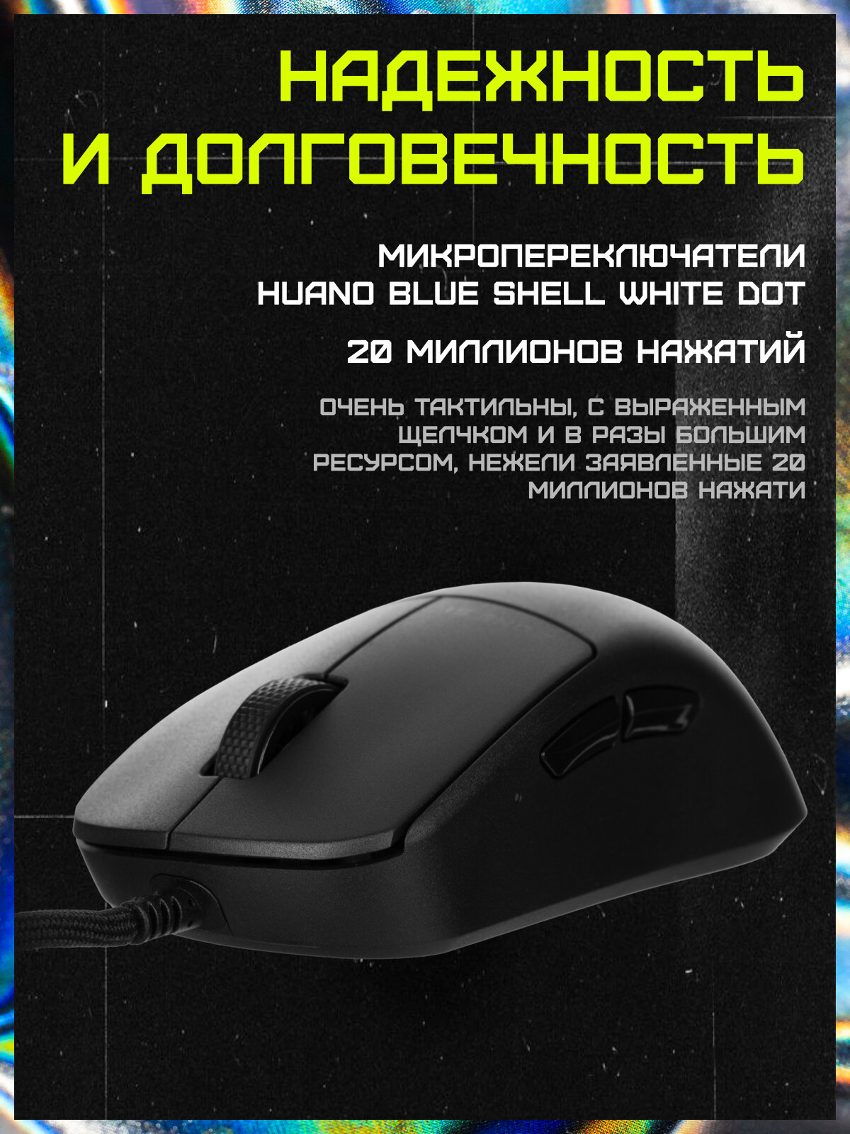 • Сверхлегкая - всего 47 г • Проверенный оптический сенсор Pixart 3327 • Эргономичная форма и идеальный размер для всех типов хвата • Переключатели Huano Blue Shell White Dot с ресурсом до 20 млн нажатий • Кабель длиной 2 метра в паракордовой оплетке Внутри ZONE 51 Sage находится оптический сенсор Pixart 3327 – хороший выбор для самых требовательных игроков. Данный оптический сенсор отлично зарекомендовал себя практически идеальным сплавом характеристик для адекватного геймера: хороший трекинг, минимальная вероятность срыва, оптимальная высота слежения за поверхностью, всеядность к игровым коврам. ZONE 51 Sage весит всего 47 грамм, что позволяет снизить инерцию при резком движении до минимума, делая контроль мыши более предсказуемым. Мышь ориентирована под правую руку, имеет средние размеры и очень плавные линии, что делает ее очень удобной и позволяет комфортно держать тремя хватами: ладонным, ладонно-пальцевым и пальцевым. Тяжелый, недостаточно гибкий кабель ощущается на любой игровой мыши, но на сверхлегкой – он ощущается вдвойне. На мыши ZONE 51 Sage установлен легкий, гибкий кабель с паракордовой оплетке, чтоб он не мешался и ты о нем не думал. На основных кнопках мыши установлены микропереключатели Huano Blue Shell White Dot на 20 миллионов нажатий. Это золотая классика. Они очень тактильны, с выраженным щелчком и в разы большим ресурсом, нежели заявленные 20 миллионов нажатий. Энкодеры от TTC всегда давали четкую фиксацию, ощутимую отсечку и отличный ресурс, что максимально отложит появление такого явления, как "даблскролл" или же отсутствие регистрации прокрутки колесика. Отличный и надежный энкодер колеса прокрутки подарит тысячи часов прокруток без надоедливого люфта.