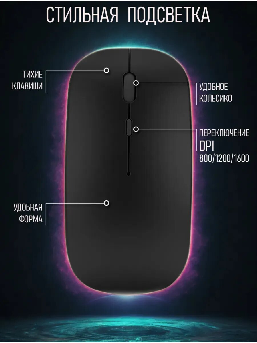 Беспроводная Bluetooth мышь со встроенной подсветкой и аккумулятором - это высокотехнологичный компьютерный аксессуар, который обеспечивает безупречную работу и максимальный комфорт. Этот гаджет подойдет как для работы с документами или в интернете, так и для игр на компьютере, ноутбуке, планшете и даже некоторых телефонов, при помощи регулировки режима dpi (800/1200/1600), Вы можете выбрать комфортную чувствительность. Аккумуляторная мышка имеет оптический модуль, благодаря которому она работает точно и плавно, а также подключается к компьютеру через Bluetooth (для устройств без USB) порта или USB-адаптер, функционирующий через Wifi (Вайфай) (для техники без внутреннего блютус). Кроме того, она имеет встроенный аккумулятор, который освобождает от необходимости подзарядки до нескольких недель (до 168 часов). Девайс поставляется в комплекте с проводом для зарядки, которую можно осуществлять через адаптер, повербанк или ноут. Девайс подходит для всех ноутбуков и компов с операционной системой: Windows, mac ios (для macbook/макбук/мак) или андроид (Android). Это отличный подарок для игроков и людей, работающих с пк, а также для всех, кто ищет качественные и удобные аксессуары и компьютерную периферию для своих устройств. Беспроводная компьютерная мышь подключается напрямую через блютуз ноутбука или адаптером в USB-порт. Обладает высокой отзывчивостью и быстрой реакцией с возможностью регулировки скорости перемещения. Форма корпуса мышки идеально подходит под правую руку и левую руку. Благодаря литиевому аккумулятору мышка не подведет даже в разгар самой ответственной работы. Подходит для работы с ноутбуком и настольным ПК. Подключается к устройствам под управлением виндос, мак, андроид или эпл. Работает по протоколу Bluetooth 5.1 или WiFi 2,4G. Анатомическая мышка подходит для продолжительной работы. Срок службы клавиш 5 миллионов раз нажатий. Бесшумная аккумуляторная мышка станет отличным подарком. Подарок мальчику на 23 февраля, подарок девочке на 8 марта