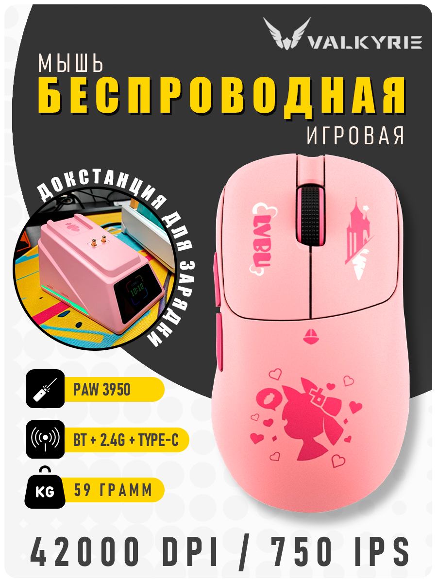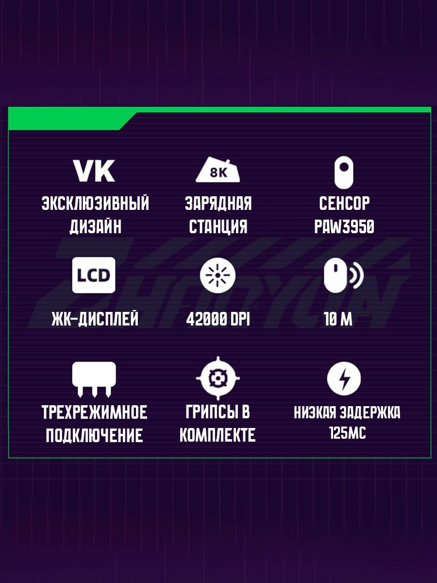 | Комплектация | 1. Мышь 2. Кабель для передачи данных TYPE-C 3. Наклейка для ног мыши 4. Зарядная база 5.Руководство |
