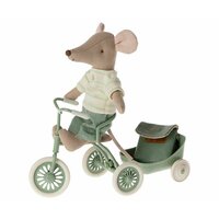 Старший брат - мышонок Maileg готов к школьному дню, у него за спиной рюкзак. В лапках мышонка - магниты, чтобы он мог держаться за ручки трёхколёсного велосипеда и быстро ехать.