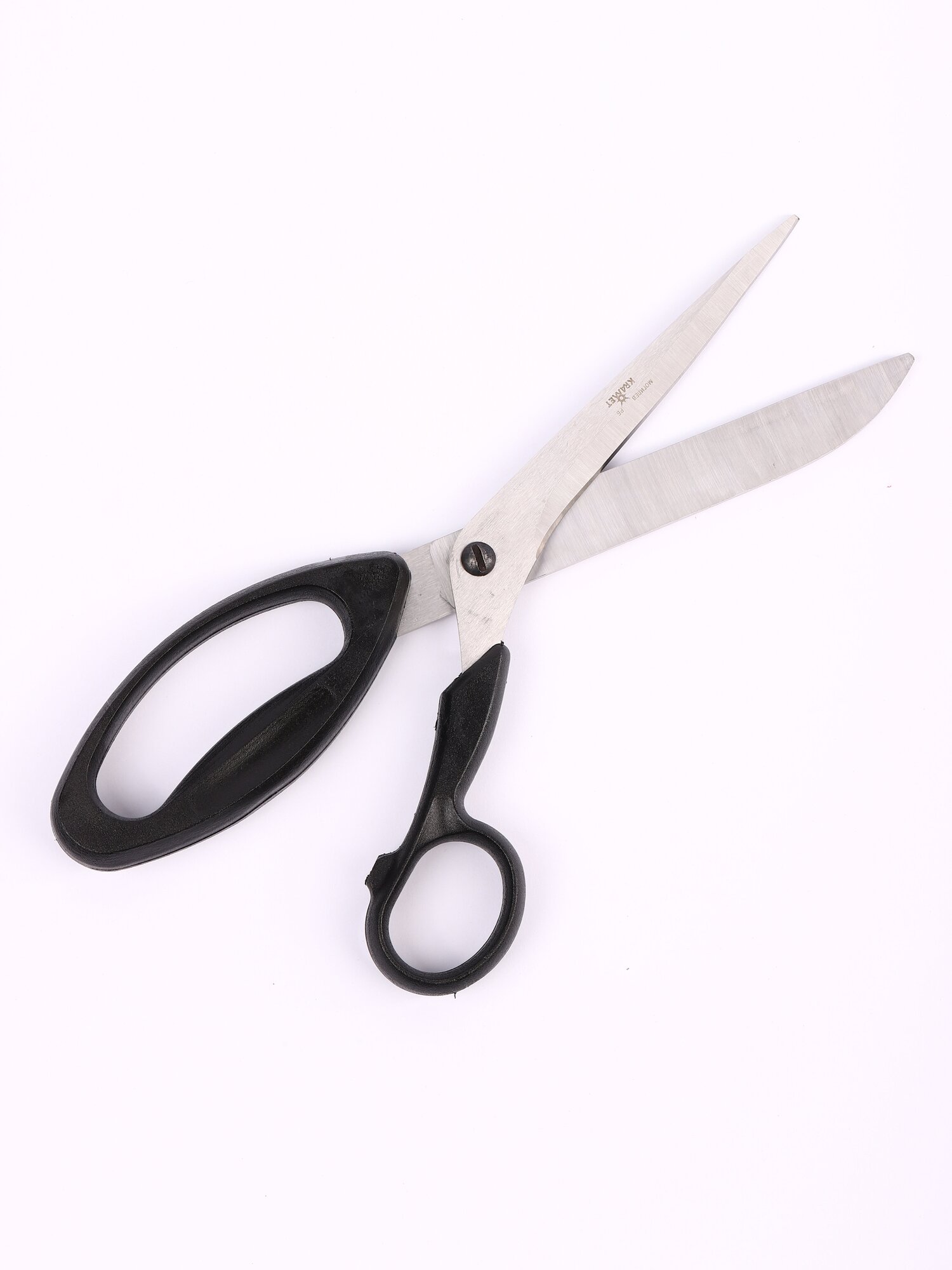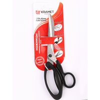 Ножницы закройные профессиональные "Крамет", 260 мм, пластиковые, эргономичные ручки эллиптической формы. Предназначены для разрезания различных материалов, включая бумагу, картон, нитки, ткани, войлок, шнур, медные и алюминиевые провода диаметром до 0,3 мм. Благодаря толщине лезвия (4 мм) и мощных ручек способны резать толстые и многослойные ткани. Ножницы имеют угол (остроту) заточки, обеспечивающий великолепное качество резки. Лезвия изготавливаются из углеродистой легированной стали (марка 40x13/AISI 420), при их закаливании достигается твердость 54 (2) HRC. Каждые ножницы поставляются на картонной подложке с европодвесом.