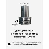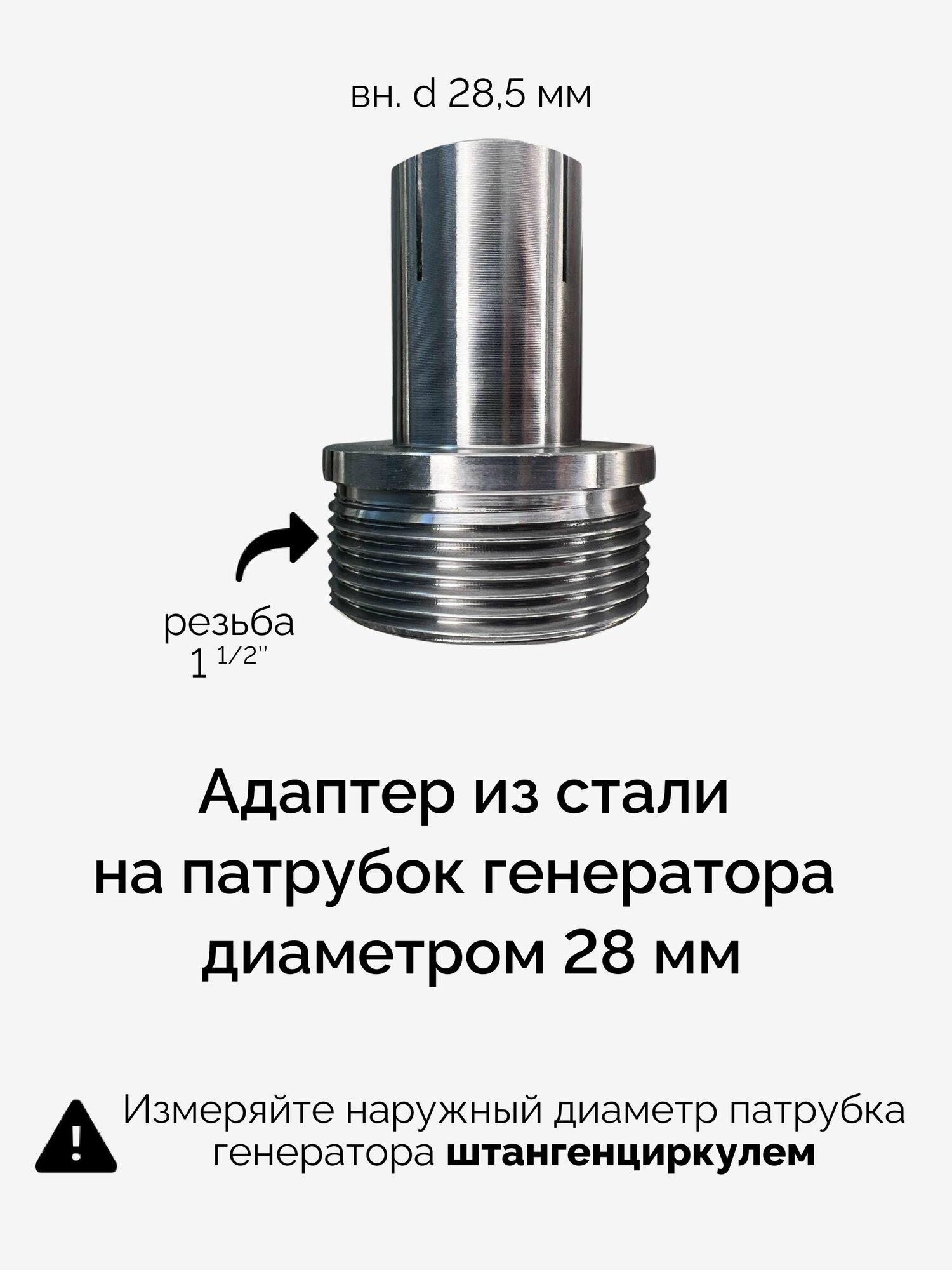 - стальной адаптер (соединяет выхлопной патрубок генератора и газоотводящую трубу. Для присоединения патрубка адаптера (внутренний диаметр 28 мм) к выхлопной трубе (внешний диаметр до 28 мм) используем стягивающий металлический хомут, для присоединения адаптера к отводящей трубе используется накидная гайка). Обратите внимание! Внешний диаметр выхлопной трубы генератора должен соответствовать или быть чуть меньше внутреннего диаметра адаптера! Если наружный диаметр выхлопного патрубка меньше 28 мм, для дополнительной изоляции используйте высокотемпературный герметик.