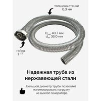 - гибкий рукав из нержавеющей стали (газоотводящая труба): с одной стороны развальцован под накидную гайку (с внутренней резьбой на 1 1/2"), с помощью которой газоотводящая труба (внутренний диаметр трубы-34,9 мм, внешний- 40,7 мм, длина – 1,5 м) соединяется с генератором через стальной адаптер. Для уплотнения соединения использована устойчивая к высоким температурам прокладка из паронита (44 мм);