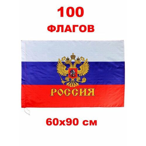 Флаг Триколор с гербом и надписью Россия 60х90 см 100 штук.