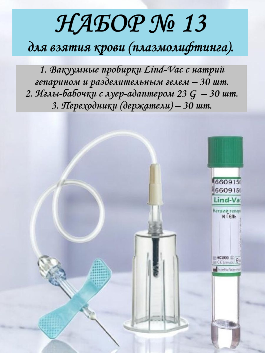 Купить Набор №13 для плазмолифтинга: Пробирки LindVac с натрий гепарином и гелем-30 шт, иглы-бабочки 23g-30 шт, держатели-30 шт с доставкой по всей России. Набор №13 для плазмолифтинга: Пробирки LindVac с натрий гепарином и гелем-30 шт, иглы-бабочки 23g-30 шт, держатели-30 шт: сравнение цен, характеристики, фото, актуальное наличие и цены.