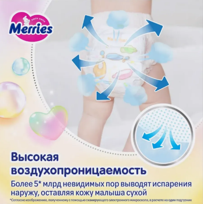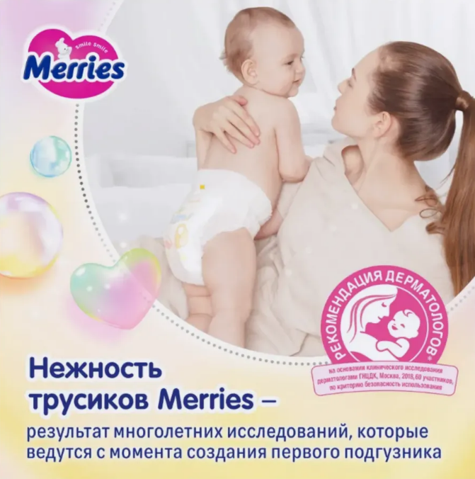 Детские одноразовые японские трусики-подгузники Merries (Меррис) для малышей с весом от 9 до 14 кг (размер L, 4) созданы с особенной заботой о коже и комфорте Вашего ребёнка. Идеально подойдут малышу, который активно ползает, делает первые шаги и исследует мир вокруг. Merries – победитель премии «Марка №1 в России» в 2022 г. в категории «Подгузники и трусики для детей» и лучший бренд для малышей по признанию мам. Анатомический крой трусиков Меррис, учитывающий все особенности растущего малыша, обеспечивает комфорт и свободу движений ребёнка. Трусики легко снимать, надевать и удобно носить. Они хорошо сидят на талии, не сползают, не жмут и не оставляют следов на нежной коже малыша. Трусики Merries хорошо подходят как дневные подгузники, когда ребёнок максимально подвижен, так и в качестве ночных подгузников, когда малыш дольше не переодевается. Удлинённый впитывающий слой в задней части трусиков предотвращает протекание, когда ребёнок долго лежит на спине. А оборочки нежно облегают ножки и не образуют щелей, даже если ребёнок много ворочается ночью. Гипоаллергенные материалы не вызывают раздражений, опрелостей и дискомфорта. Полимерный абсорбент отлично впитывает большое количество жидкости, превращает её в гель и защищает от протеканий даже при значительном надавливании. Внутренняя поверхность трусиков остаётся удивительно мягкой для кожи ребёнка и не прилипает к попке даже после того, как впитает большой объём жидкости. Трёхполосный индикатор наполнения легко проверить, не раздевая полностью малыша. Если полоски сменили цвет, трусики пора заменить на новые. Мягкий эластичный поясок не давит на животик и растягивается в 2,5 раза, что позволяет легко сменить трусики, когда малыш лежит. Трусики Merries подходят для девочек и для мальчиков. Не требуют использования защитных кремов и присыпок.