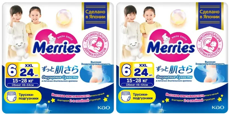 Набор 2 х Merries трусики XXL (15-28 кг), 24 шт: сравнение цен, характеристики, фото, актуальное наличие и цены.
