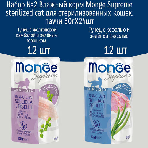 Набор №2 Влажный корм для стерилизованных кошек Monge Supreme sterilized, паучи 24 шт по 80гр (2 вкуса по 12шт): сравнение цен, характеристики, фото, актуальное наличие и цены.