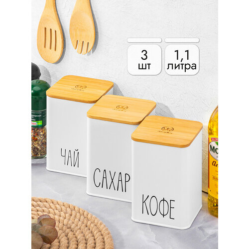 Набор состоит из трёх белых банок для сыпучих продуктов с бамбуковыми крышками. Объём каждой банки – 1,1 литра, размер – 9,5х9,5х14,5 см. Банки выполнены из высококачественного металла, что обеспечивает прочность и долговечность использования. Украшены надписями "Чай", "Кофе", "Сахар". Бамбуковые крышки позволяют сохранить свежесть и аромат продуктов, а также защищают содержимое от пыли и влаги. Банки для сыпучих продуктов позволят не просто хранить чай, кофе и сахар на вашей кухне, но и станут элементом её декора. Можно использовать для соли, приправ, специй, круп или орехов. Декоративная посуда поможет не только навести порядок на вашей кухне, ее стильный дизайн подойдет к любому интерьеру и поможет создать на кухне уют. Используйте банки не только для сыпучих продуктов, но и конфет, печенья и других сладостей. Кухонные баночки подойдут к интерьеру в любом стиле. Не рекомендуется применять абразивные моющие средства. Не использовать в СВЧ и ПММ. Весь набор выполнен в стильном и элегантном дизайне и может стать прекрасным украшением вашего интерьера. Идеальный вариант подарка для мамы, бабушки, сестры и даже коллеги. Такая посуда станет настоящим украшением вашей кухни и поможет создать в доме порядок и уют!
