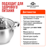 Набор кастрюль с крышкой Mayer-Boch из нержавеющей стали. Набор посуды из 6 предметов: кастрюля 1,5 л, кастрюля 2,0 л, кастрюля 3,0 л и три стеклянные крышки разного диаметра ( 16,18,20 ) - это незаменимый предмет на любой кухне. Кастрюли имеют капсульное дно, которое быстро и равномерно нагревается; подходят для разных видов плит: газовые, электрические, индукционные и все остальные. Отлично подходят для приготовления: супа, каши, овощей, макаронных изделий и других блюд. Кастрюли из высококачественной нержавеющей стали сочетает в себе долговечность, устойчивость к коррозии, прочность и функциональность. Комплект посуды нержавеющая благодаря элегантному дизайну подойдут к любому интерьеру. Это идеальный выбор для одного, двух или трех человек. В комплект входят стеклянные крышки с металлическим ободом и клапаном для выпуска пара. Оснащены удобными термостойкими клепаными ручками. Подходят для посудомоечных машин. Нельзя использовать в микроволновых (СВЧ) печах. Изделие Mayer-Boch будет прекрасным и функциональным и практичным подарком для вас, ваших близких и знакомых, которые готовят с удовольствием и украшают праздничный стол. Поможет вам определиться с подарком на Новый год, Рождество, День Рождения, 8 марта, День Святого Валентина, Новоселье и Свадьбу. Это универсальный и полезный подарок жене, маме, бабушке, друзьям. Красивая и стильная упаковка