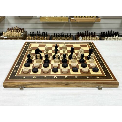 Размер доски 50 x 50 СМ. Размер игрового поля 40x40 СМ. Размер клетки 5 СМ. Сделаны в россии. Материал светлой доски ясень. Материал темной доски красное дерево. Материал фигур БУК. Материал фишек БУК. Высота короля 10 СМ. Высота пешки 5 СМ. Диаметр основания фишек 30 мм.