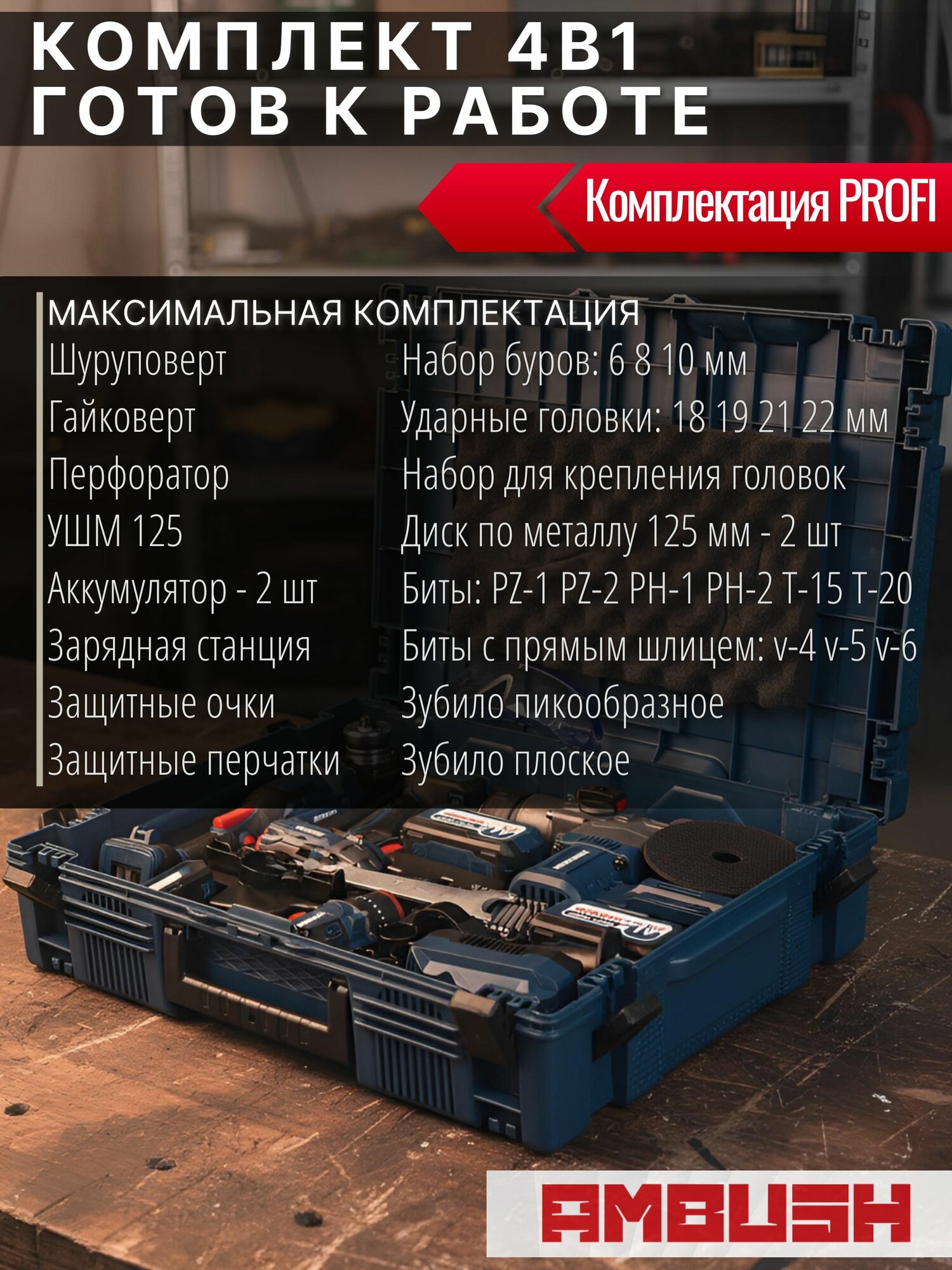 Набор 4 в 1 AMBUSH Шуруповерт Гайковерт Перфоратор УШМ, 2 аккумулятора 21В. Максимальная комплектация: сравнение цен, характеристики, фото, актуальное наличие и цены.