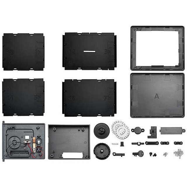 | Подробная комплектация | 6 панелей для сборки корпуса, передняя дверца с контактами и сигнализацией, задняя дверца с отсеком для батареек, циферблат, храповик и храповой рычаг, переключатель с корпусом, детали замка и ключ, винтики и другие крепления, инструкция |