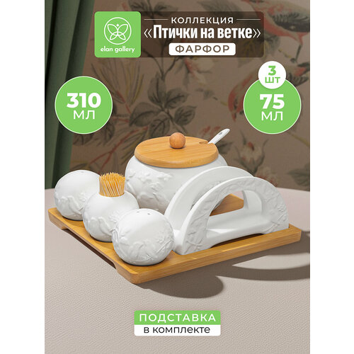 Набор посуды на бамбуковой подставке из серии «Птички на ветке» от бренда Elan Gallery предназначен для эстетичной сервировки вашего стола. Включает сахарницу с ложкой, набор для специй, вазочку для зубочисток и салфетницу. Размер комплекта – 20,5х19,5х9,5 см. Подставка и крышка сахарницы выполнены из натурального бамбука. Посуда выполнена из высококачественного белого фарфора. Он не впитывает цвет продуктов и легко отмывается, благодаря чему надолго сохранит свою белизну. Поверхность изделий украшает рельефный рисунок в виде лиственных веточек, на которых сидят птички. Размер сахарницы – 11х11х8,5 см, объём – 310 мл. Подойдёт для сахара, соли и других сыпучих продуктов. Подайте её вместе с горячими блюдами, чтобы каждый мог приправить пищу по своему вкусу. Приспособьте под варенье, мёд или икру. Ложечка позволит удобно набрать необходимое количество продуктов и компактно помещается в баночке благодаря выемке на крышке. Размер каждой маленькой ёмкости – 6х6х5 см, объём – 75 мл. Набор для специй позволит держать под рукой необходимые приправы. Наполняются через отверстие снизу и закрываются пластиковой пробкой. Вазочка для зубочисток станет удобной гигиеничной принадлежностью. Зубочистки не входят в комплект. Размер салфетницы – 13,5х4,5х7 см. Она послужит для компактного хранения салфеток и бумажных полотенец. Не рекомендуется применять абразивные моющие средства. Фарфоровые ёмкости подходят для использования в посудомоечной машине и микроволновой печи. Бамбук нельзя замачивать! Поставляются в дизайнерской картонной коробке – благодаря ей вам не потребуется дополнительная подарочная упаковка. Фарфоровая сервировочная посуда будет оригинальным подарком для хозяйки, ценящей не только практичность, но и привлекательность. Серия «Птички на ветке» от бренда Элан Галерея станет украшением любого кухонного инвентаря и позволит собрать красивый сервиз в едином стиле!
