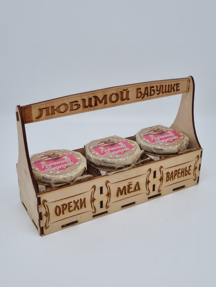 Акациевый мёд, варенье (конфитюр) и мёд с орехами ассорти в подарочном деревянном лотке для поздравления любимой бабушки с Днем рождения или любым другим праздником.