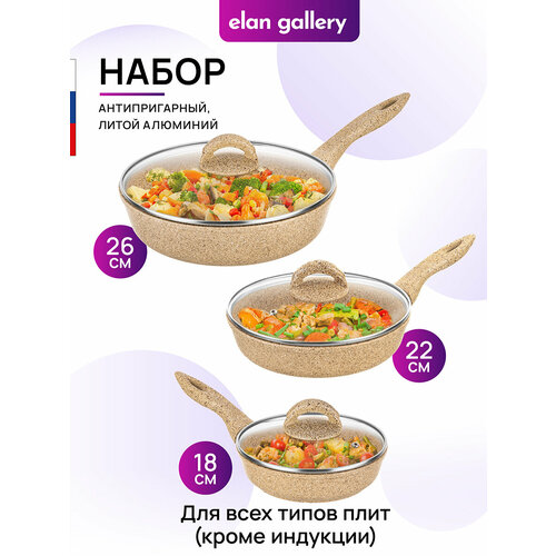 Купить Набор 6 пр. Elan Gallery гармония вкуса Медовый гранит Сковороды глубокие 18 см, 22 см, 26см, 3 крышки, несъемные ручки с доставкой по всей России.
