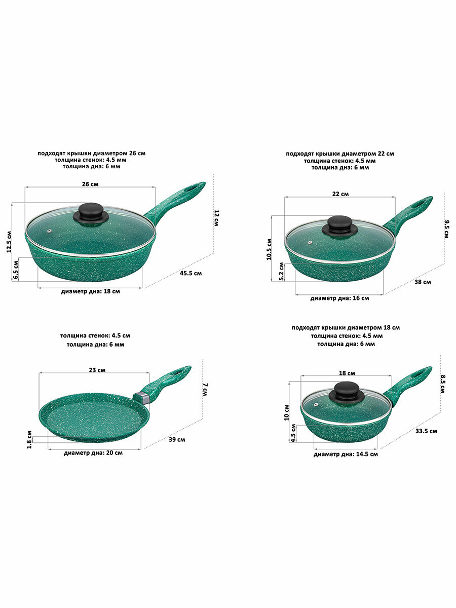 Набор 7 пр Elan Gallery гармония вкуса Изумруд Сковорода блинная 22 см, Сковороды 18 см,22 см,26 см, 3 крышки, н/р: сравнение цен, характеристики, фото, актуальное наличие и цены.