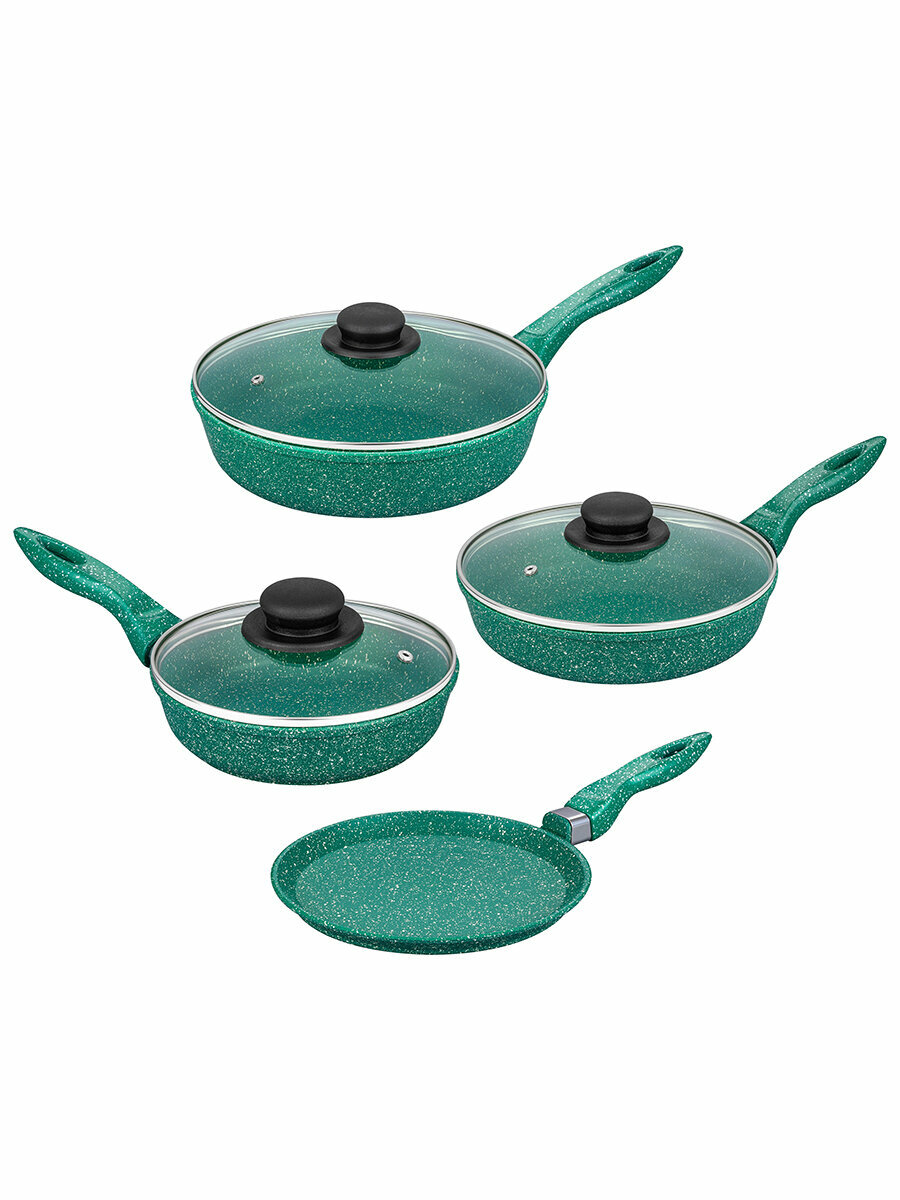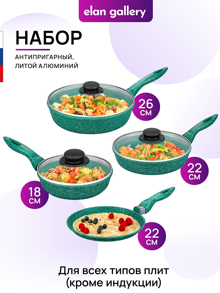 Купить Набор 7 пр Elan Gallery гармония вкуса Изумруд Сковорода блинная 22 см, Сковороды 18 см,22 см,26 см, 3 крышки, н/р с доставкой по всей России.