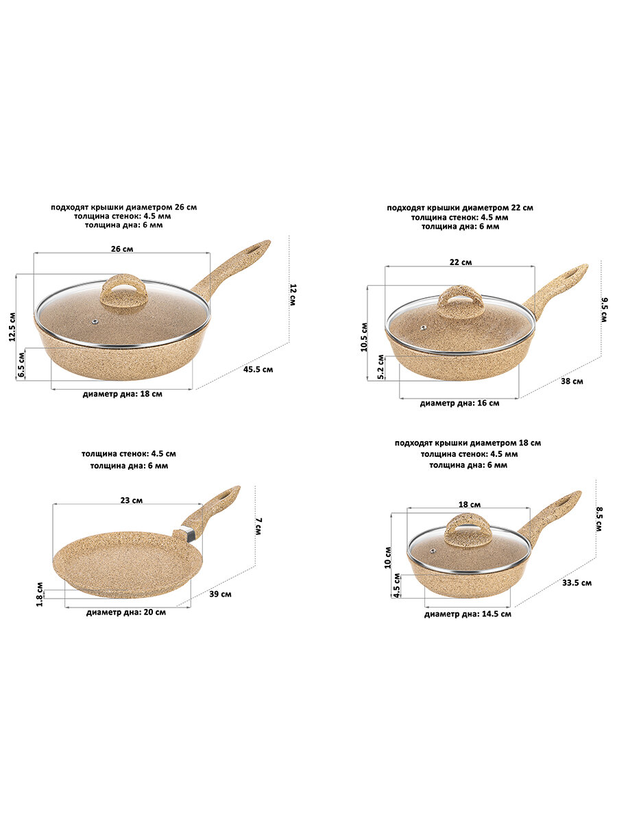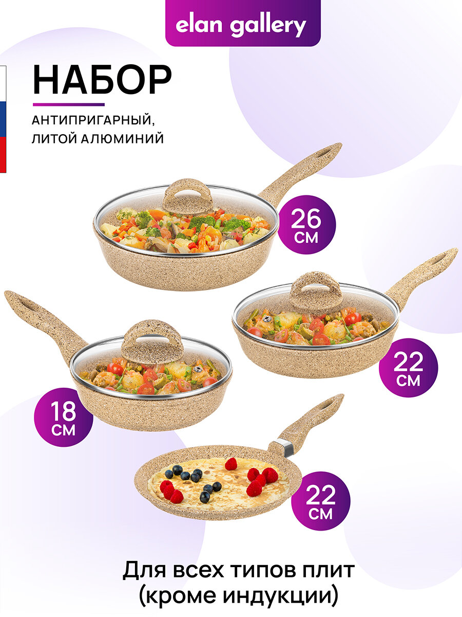 Набор 7 пр Elan Gallery гармония вкуса Медовый гранит Сковорода блинная 22 см, Сковороды 18см,22см,26см, 3 крышки, н/р: сравнение цен, характеристики, фото, актуальное наличие и цены.