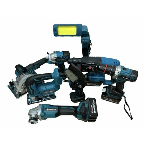 Новинка ! Полностью безщеточный набор электроинструментов 8 в 1, Аккумуляторы Li-ion 6AH- 4 штуки Зарядное устройство док. станция - УШМ Двигатель Бесщеточный Скорость вращения 8500 об/мин Диаметр диска :125мм - Гайковерт Бесщеточный Крутящий момент 286N. m -Перфоратор Мак. сила удара Дж 2,5 Максимальное количество ударов 4700 уд/мин , Макс. частота вращения шпинделя об/мин: 0-950 - Шуруповерт Бесщеточный Крутящий момент 30-80N. m Макс. об.0-350-1800 Диаметр патрона 10мм - Плиткорез Мощность: 1000 Вт Скорость без нагрузки: 6500-12500 об/мин Диаметр пильного полотна: 125 мм (5 дюймов) Угол: от 0° до 45° регулируемый Глубина реза: 20-45 мм Диаметр пластины: 20 мм Применение: дерево, ПВХ, МДФ, камень, керамическая плитка и т. д. -Цепная пила 4 дюйма, блокировка случайного включения, мини пила удобная в руке, для мелких сучков, веток и кустов -лобзик аккумуляторный -фонарик аккумуляторный