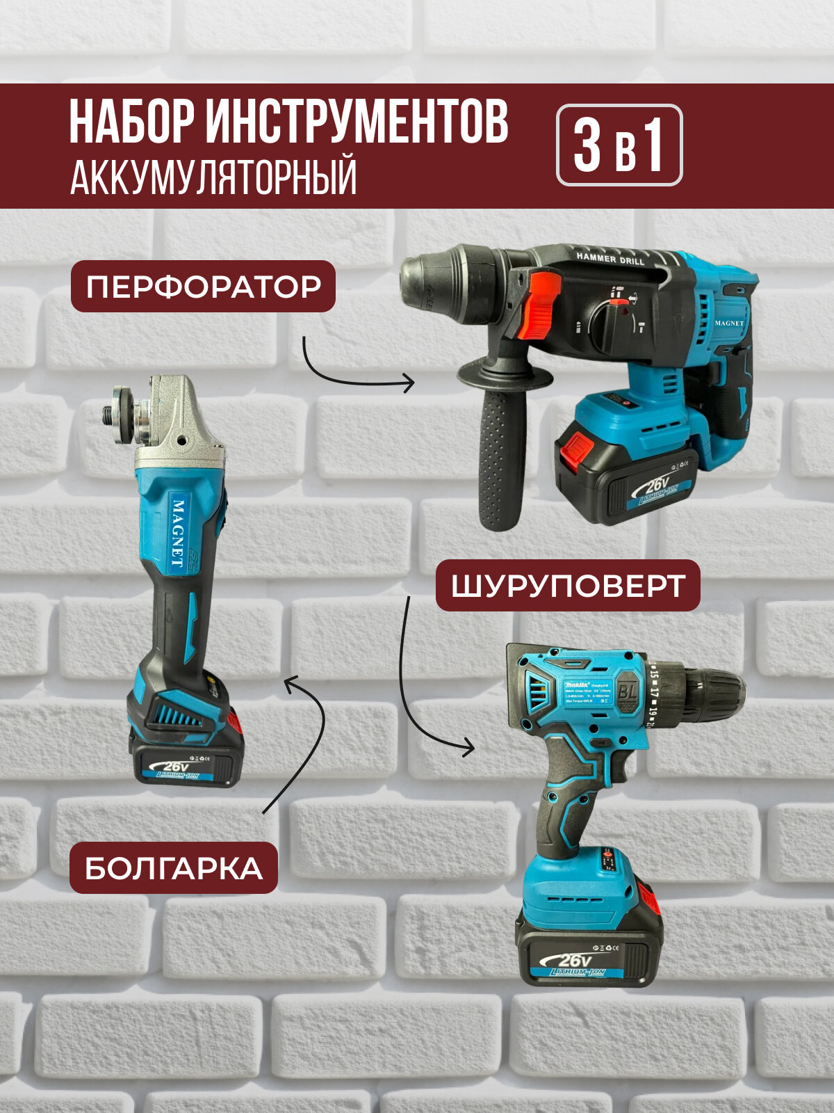 Купить Набор аккумуляторных инструментов 3в1 (болгарка, шуруповерт, перфоратор) с доставкой по всей России. Набор аккумуляторных инструментов 3в1 (болгарка, шуруповерт, перфоратор): сравнение цен, характеристики, фото, актуальное наличие и цены.