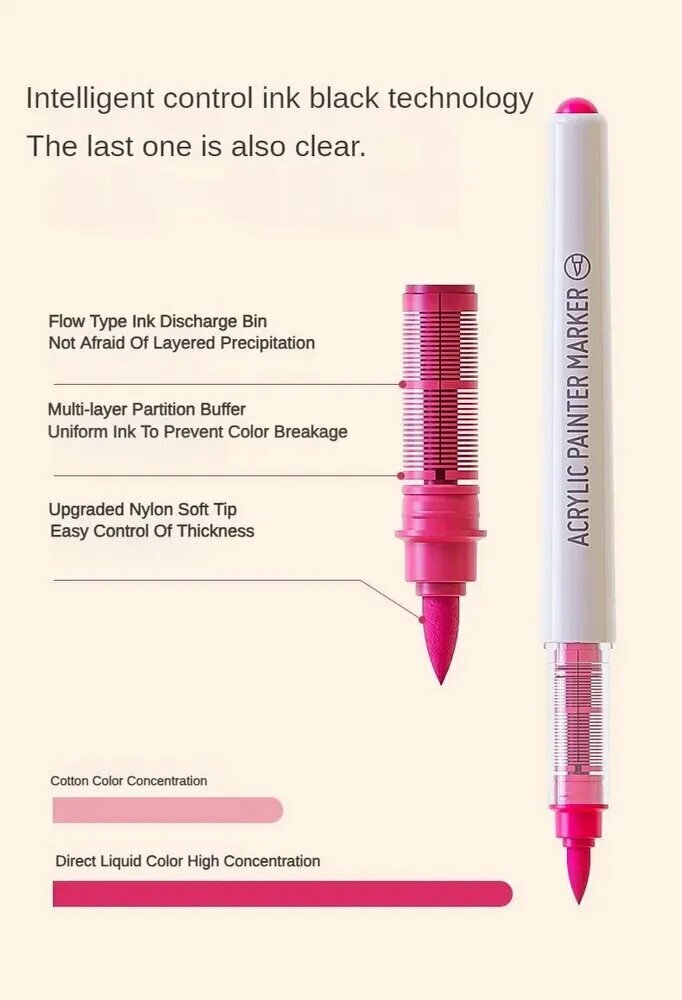 Каждый маркер оснащен удобным наконечником-кисточкой, что позволяет вариативно управлять толщиной линии в зависимости от вашего замысла. Акриловая основа обеспечивает превосходное покрытие и яркость цвета, сохраняя свои свойства даже на различных поверхностях. Независимо от того, используете ли вы маркеры для работы, хобби или создания уникальных подарков – они помогут вам перенести ваши идеи на бумагу с легкостью и стилем.