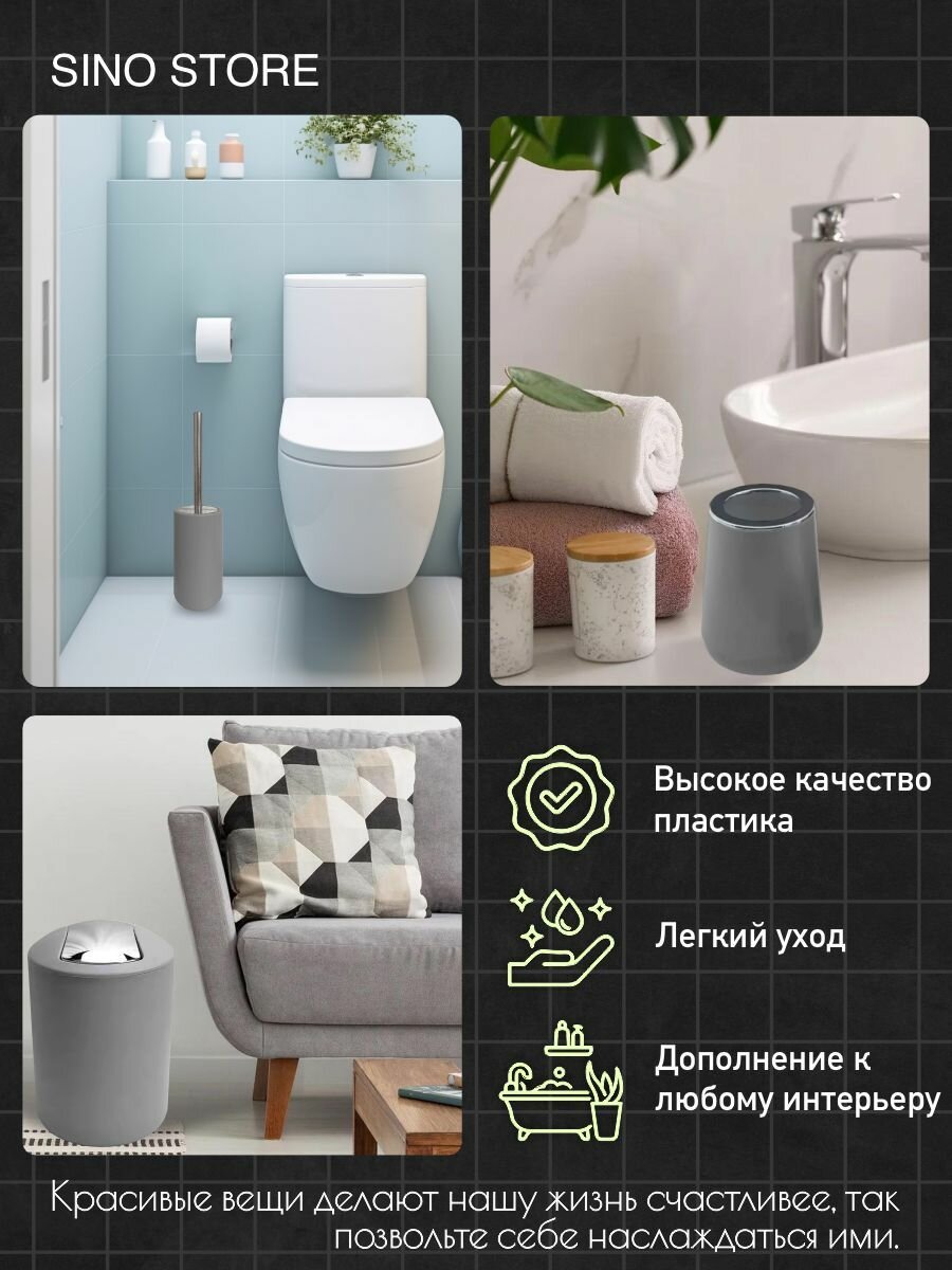 Набор аксессуаров для ванной комнаты и туалета состоит из 6 предметов: мыльница, дозатор для жидкого мыла, ёршик для унитаза с подставкой, ведро для мусора, стакан для зубных щеток с разделителем и стакан для полоскания рта. Декор для ванной комнаты должен хорошо сочетаться с интерьером, походить по стилю и дизайну и мебели для ванной. Наши товары для ванной это новинка 2024 года, выполнена из экономичного, прочного и надежного полипропиленового пластика. Отсутствует не приятный запах. Приятный на ощупь пластик не подвержен внешним воздействиям, не желтеет. Предметы легко моются в мыльной воде. Пластиковый комплект более практичный нежели набор для ванной из керамики. Модель все для ванной представлена в четырех различных цветах: белый, серый, черный, бежевый. Все элементы набора выдержаны в однотонном цвете, что придаст эстетики и украсит пространство интерьер в Вашей ванной комнате. Оригинальный дизайн всех принадлежностей дополнит интерьер и добавит удобства. Диспенсер подходит для различных видов жидкого мыла, зубные щетки больше не потеряются благодаря держателю органайзеру для зубных щеток и пасты, стакан для ванной, ершик для туалета имеет прочную ручку, она не деформируется и не рассыпается на части при использовании. Мусорное ведро позволяет сочетать данный набор с баночками для ванной, смесителями до полки для органайзера. Ерш туалетный и дозатор для жидкого мыла покрыты очень качественным и блестящим хромом, который не стирается и ярко блестит.