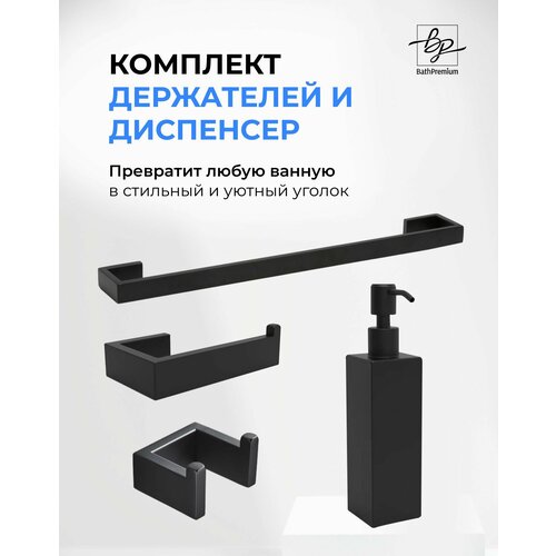 Представляем вам стильный набор аксессуаров для ванной комнаты и туалета от бренда BathPremium премиум класса, 4 предметы. В комплект входит держатель для туалетной бумаги, вешалка для полотенец 40 см, двойной крючок и дозатор для жидкого мыла. Изготовлены из качественной нержавеющей стали. Черное матовое влагостойкое покрытие высокого качества защищает изделие от коррозии и продлевает эксплуатационный срок. Прочный металлический сплав покрыт инновационным напылением, которое защищает металл от внешнего воздействия. Поэтому он долговечен, устойчив к влажности, плесени, истиранию и механическим повреждениям.