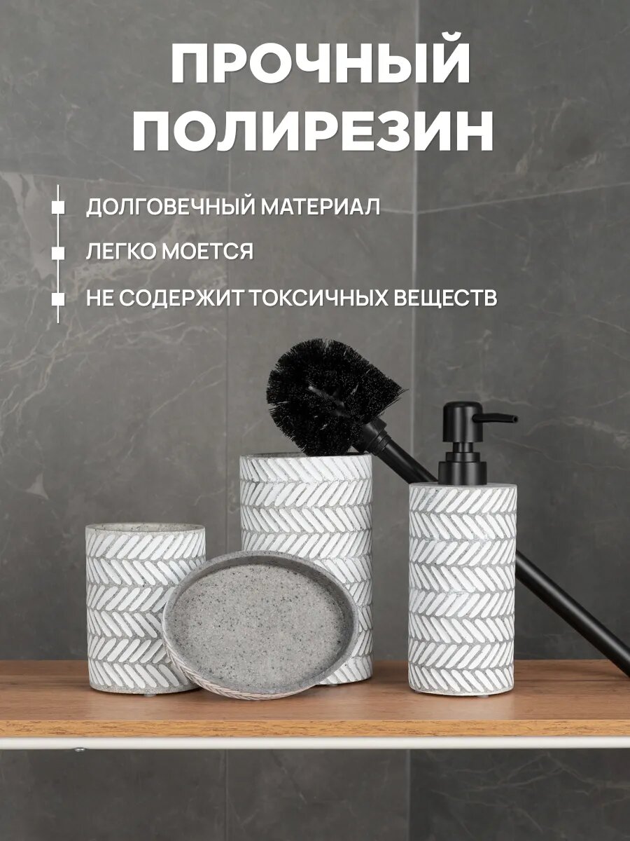 - дозатор для жидкого мыла; - мыльница для твердого мыла; - стакан под зубные щетки или другие ванные принадлежности; - ершик для унитаза.