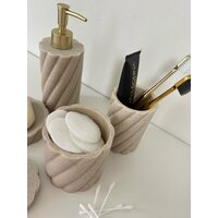 Каждый элемент набора объединяет практичность и современный дизайн, позволяя гармонично вписываться в любой интерьер. Текстура, напоминающая камень, придаёт натуральный и элегантный вид, что делает этот набор аксессуаров не только красивым, но и долговечным. Включение ершика в комплект делает его особенно удобным, ведь теперь у вас есть всё необходимое для создания уюта и комфорта в ванной.