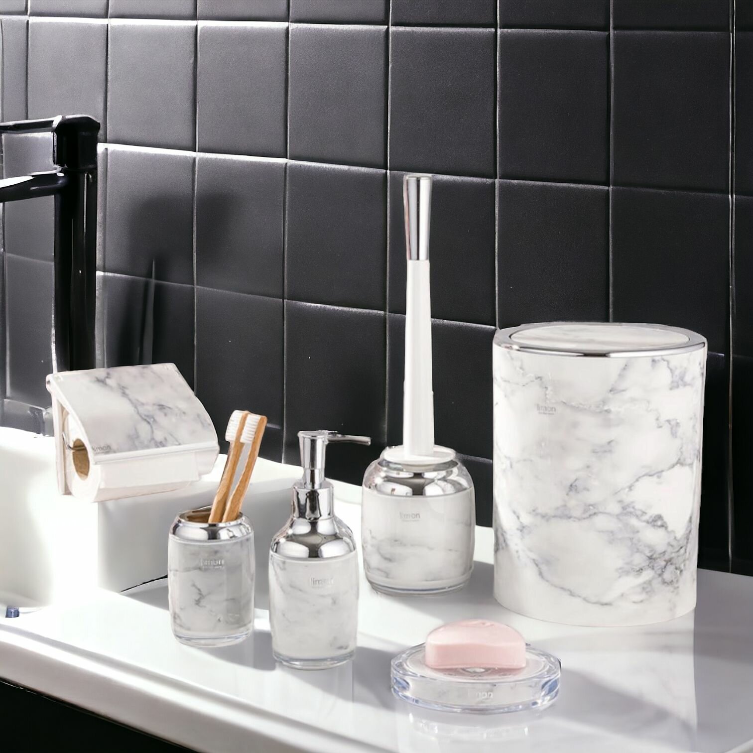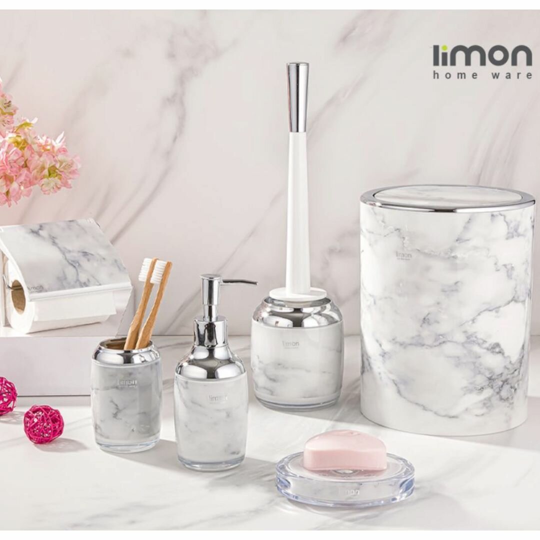 Стильный набор для ванной комнаты и туалета из мусорного ведра, ершика на подставке, мыльница, дозатор для жидкого мыла а также держатель для туалетной бумаги, от известного иранского бренда Limon отлично впишется в интерьер любой современной ванной комнаты или туалета и будет радовать Вас своим дизайном, качеством и удобством в использовании. Компания Limonware уделяет особое внимание качеству и дизайну своей продукции. Набор аксессуаров для ванной комнаты изготовлен из высококачественного абс пластика и акрила. Ведро для мусора имеет объем 5,5л. 19х19х25см. высота ершика 38см. размер подставки 9х9х13см. Поверхность поставки для ершика и ведро глянцевые, визуально смотрятся как стеклянные. Ершик для унитаза сборный, состоит из трех закручивающихся частей, что позволяет менять щетку при необходимости. Ведро для мусора можно использовать не только в ванной комнате, туалете, но и на кухне и в офисе. Крышка ведра открывается от легкого прикосновения. Набор аксессуаров для ванной комнаты и туалета в красивой подарочной упаковке- отличный подарок как для себя, так и для родных и близких на любой праздник и событие! Приятных Вам покупок! Мусорное ведро и ершик на подставке для ванной комнаты и туалета , ершик на подставке для унитаза , мусорное ведро для туалета , маленькое мусорное ведро для кухни , ершик для туалета , мусорное ведро в ванную комнату , аксессуары для ванной комнаты , аксессуары для туалетной комнаты , мусорное ведро , маленькое ведро для мусора .