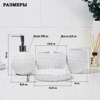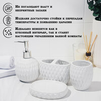 Набор аксессуаров организует пространство и станет стильным украшением Вашей ванной комнаты. За счет сдержанного дизайна данный керамический набор в ванную подойдет к любому дизайну ванной комнаты. Набор состоит из 4 предметов: 2 стакана, мыльница, дозатор.