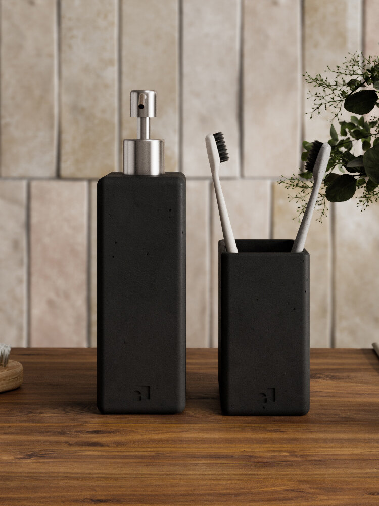 Набор аксессуаров для ванной комнаты есть в каждой локации. Где-то незаметно стоит в углу, где-то на самом видном месте, куда неглядя можно дотянуться. Представьте, что едва проснувшись утром, вы завариваете кофе и заходите в ванную комнату. В большом зеркале видите свое утреннее отражение, предметы интерьера, небольшой и аккуратный набор Oxford для ванной комнаты. Выполненный компанией de coore из архитектурного бетона ручной работы, исполненный с трепетом для вашего быта поутру в ванной комнате или незадолго до сна перед принятием горячей ванны после рабочего или насыщенного событиями вечера.