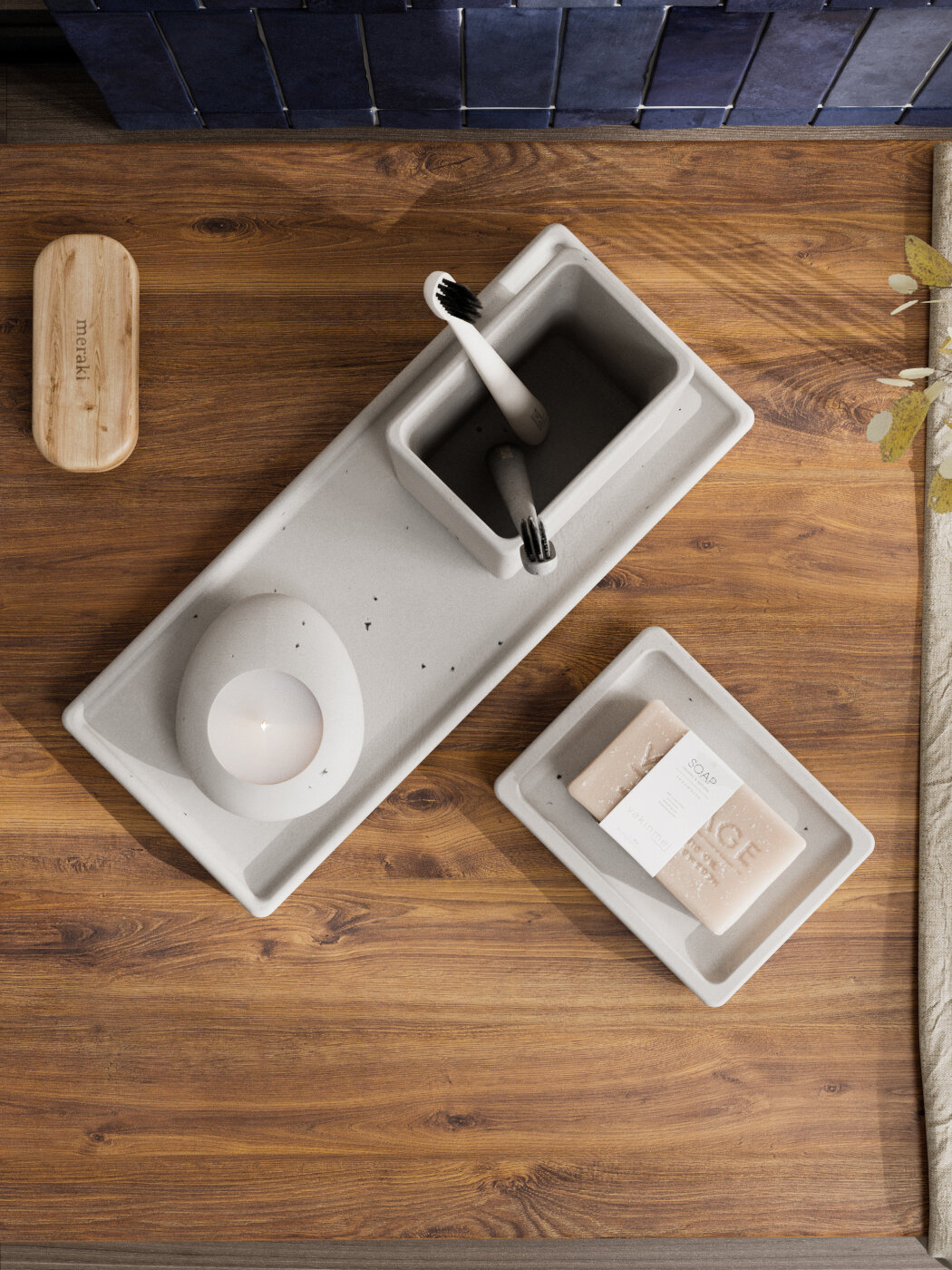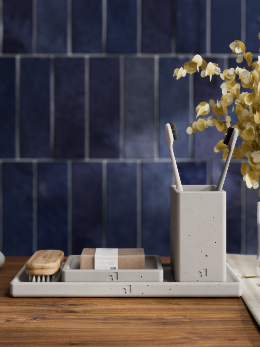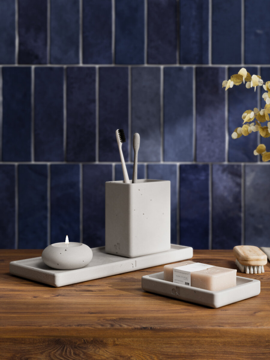 Набор аксессуаров для ванной комнаты есть в каждой локации. Где-то незаметно стоит в углу, где-то на самом видном месте, куда неглядя можно дотянуться. Представьте, что едва проснувшись утром, вы завариваете кофе и заходите в ванную комнату. В большом зеркале видите свое утреннее отражение, предметы интерьера, небольшой и аккуратный набор Oxford для ванной комнаты. Выполненный компанией de coore из архитектурного бетона ручной работы, исполненный с трепетом для вашего быта поутру в ванной комнате или незадолго до сна перед принятием горячей ванны после рабочего или насыщенного событиями вечера.