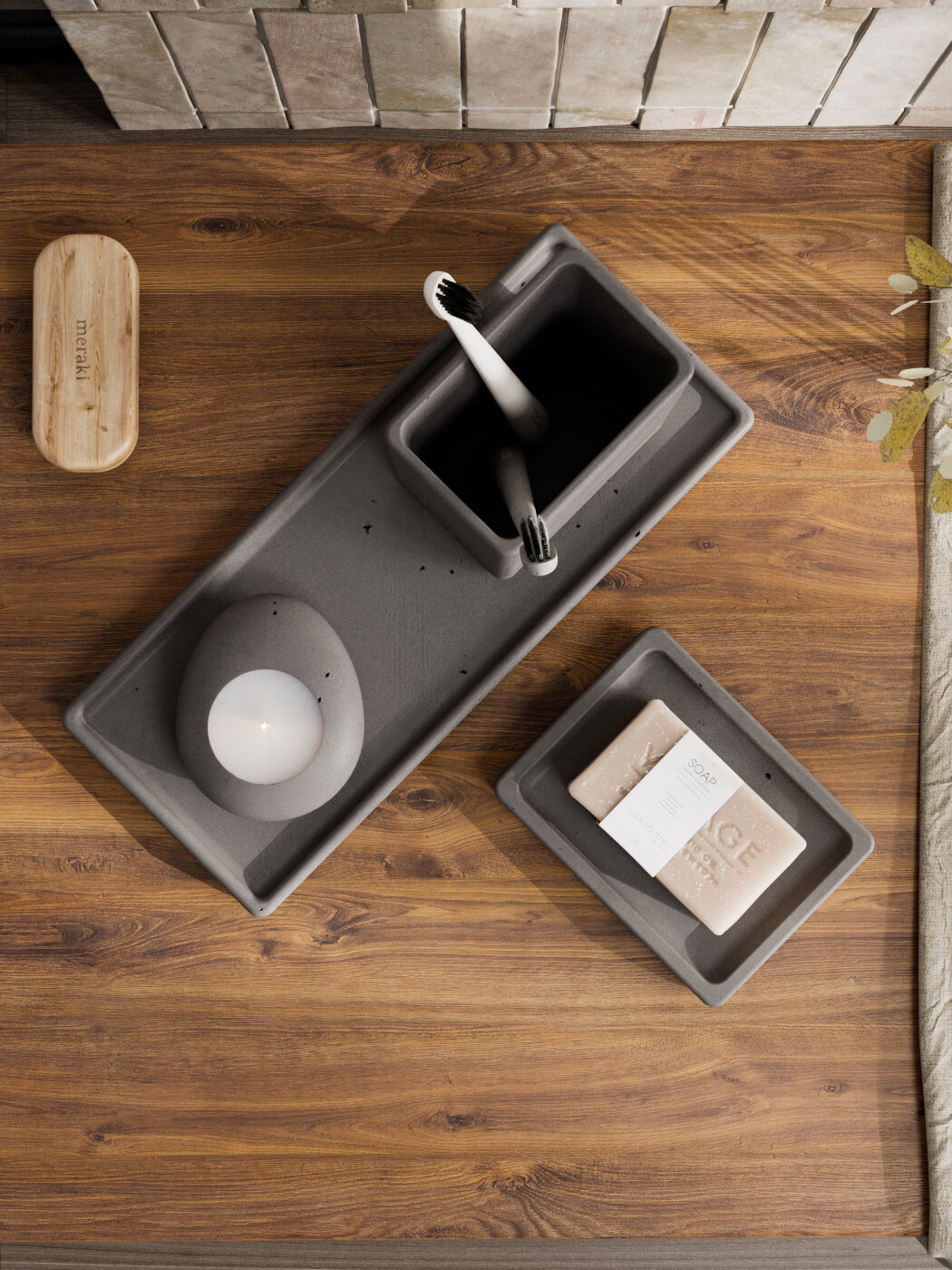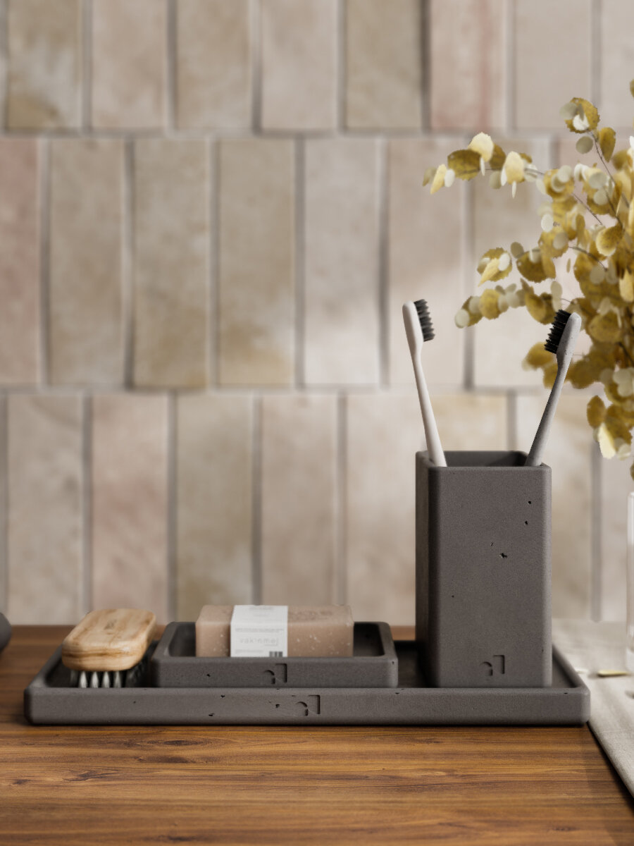 Набор аксессуаров для ванной комнаты есть в каждой локации. Где-то незаметно стоит в углу, где-то на самом видном месте, куда неглядя можно дотянуться. Представьте, что едва проснувшись утром, вы завариваете кофе и заходите в ванную комнату. В большом зеркале видите свое утреннее отражение, предметы интерьера, небольшой и аккуратный набор Oxford для ванной комнаты. Выполненный компанией de coore из архитектурного бетона ручной работы, исполненный с трепетом для вашего быта поутру в ванной комнате или незадолго до сна перед принятием горячей ванны после рабочего или насыщенного событиями вечера.
