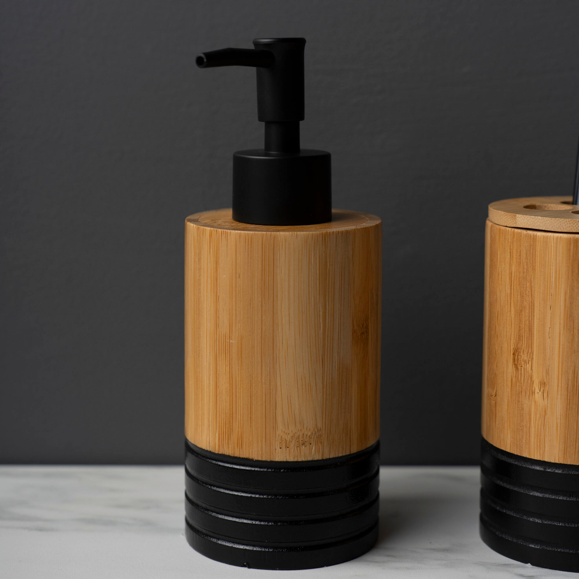 Преобразите Вашу ванную комнату с нашим набором аксессуаров «Miyoshi» из натурального бамбука! Этот набор представляет собой идеальное сочетание элегантного дизайна и высокого качества. Аксессуары из бамбука придают интерьеру ванны натуральность и природную красоту, делают пребывание в ванной максимально комфортным и уютным. Все изделия выполнены из бамбука, который обладает высокой прочностью и стойкостью к повреждениям. Этот изысканный комплект состоит из трех предметов: - дозатор для жидкого мыла или мыльных средств; - стакан для щеток, зубной пасты или аксессуаров; - мыльница для твердого мыла. Диспенсер с утонченным черным носиком можно использовать с разными жидкими моющими средствами и гелями. Декоративный стаканчик может использоваться не только под щетки, но и в качестве хранения элементов косметики. Эта деревянная коллекция аксессуаров является идеальным украшением для интерьера в стиле лофт. Ее стильные предметы могут легко сочетаться с другими баночками и пластиковыми аксессуарами в Вашей душевой комнате или туалете. Благодаря своему компактному дизайну, элементы этого набора для утреннего умывания легко разместить на небольших полочках. Создайте эстетически приятное и функциональное пространство с этой универсальной коллекцией. Это именно те мелочи, которые необходимы в ванну в качестве декора интерьера и завершающего штриха после ремонта. Такая коллекция туалетных принадлежностей являются предметами необходимыми в любом домашнем или дачном санузле.
