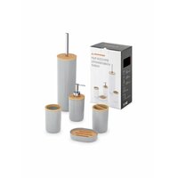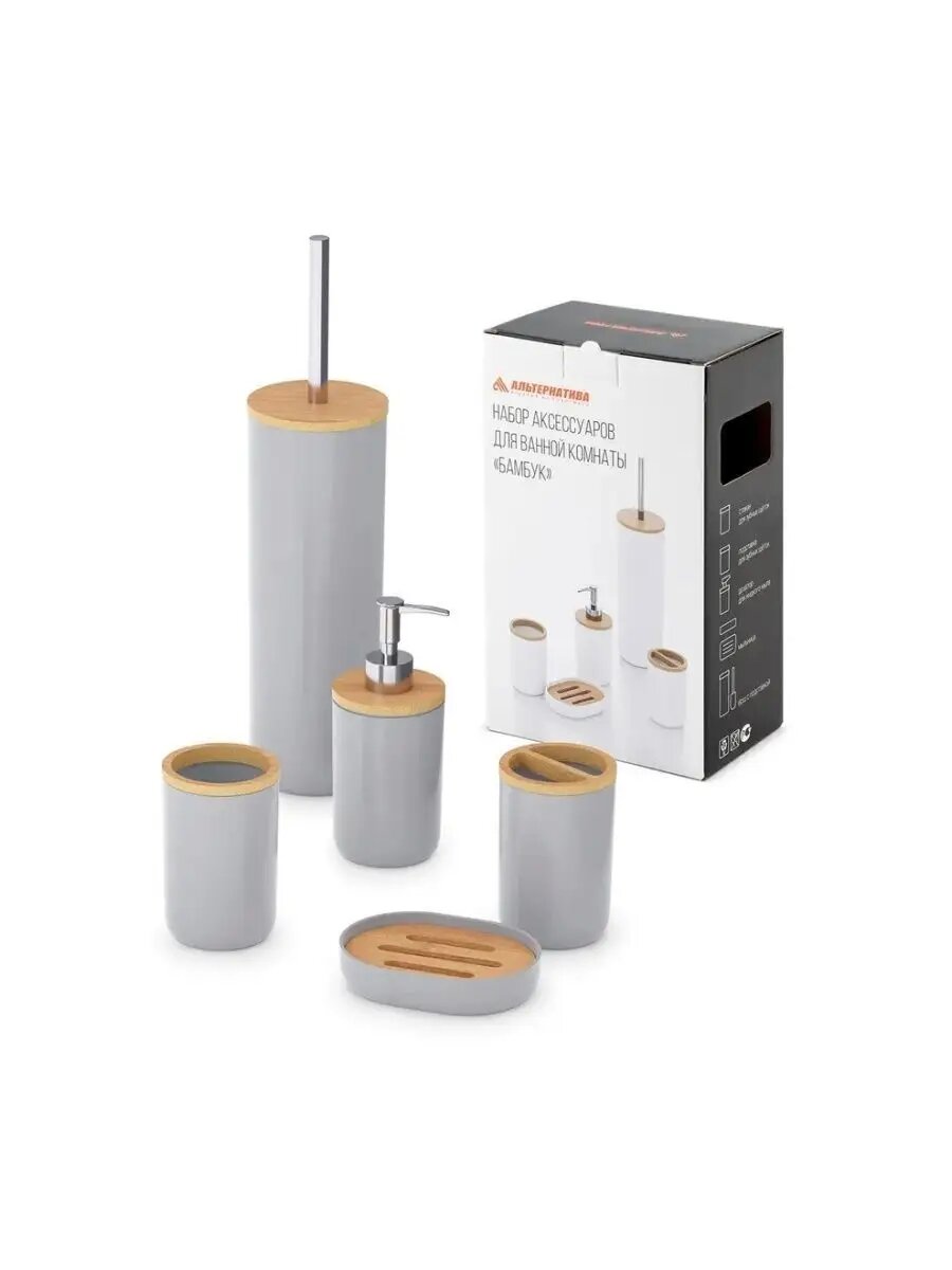 коллекция «бамбук» сочетает в себе два материала: пластик и бамбук, пластик устойчив к внешним воздействиям и легко моется, бамбуковые вставки обработаны для защиты от влаги и плесени, набор включает подставку для зубных щеток, стакан для зубных щеток, мыльницу, дозатор для жидкого мыла и ерш с подставкой