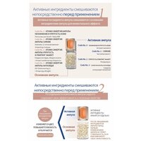 Набор включает в себя 4 ампулы с различными активными ингредиентами, такими как гиалуроновая кислота, церамиды, витамин C, ресвератрол, растительные липосомы, протеин из люпина, комплекс витаминов В, витамины А, L, E, P, H, 8 видов пептидов, а также экстракты малахита, водорослей, инжира, центеллы азиатской, питая, нарцисса и цветков ландыша.