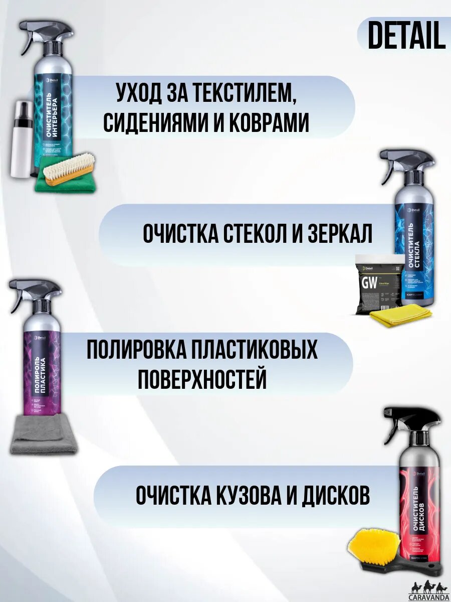 Набор автомобилиста подарочный. Качественная химия Детейл. Набор для детейлинга - отличный подарок мужчине на день защитника отечества 23 февраля. Очиститель интерьера "Ultra Clean" 500мл Adapted Series Detail, Полироль пластика "Plastic" 500мл Adapted Series Detail с триггером, Очиститель стекла "Clean Glass" 500мл Adapted Series Detail с триггером, Очиститель дисков "Iron" 500мл Adapted Series Detail с триггером, Губка черная химостойкая 120х100х50 мм, 3 мифрофибры MS 35x35см, пенообразователь 150мл, бутылочка с триггером 250мл, щетка для очистки кузова и колесных дисков, щетка для текстиля(искусственный ворс), Салфетка для очистки стекла GW Glass Wipe 40x40см Набор Detail(Детейл) с комплектацией в 11 предметов лучшая автокосметика, подобранная специально для вашего автомобиля.
