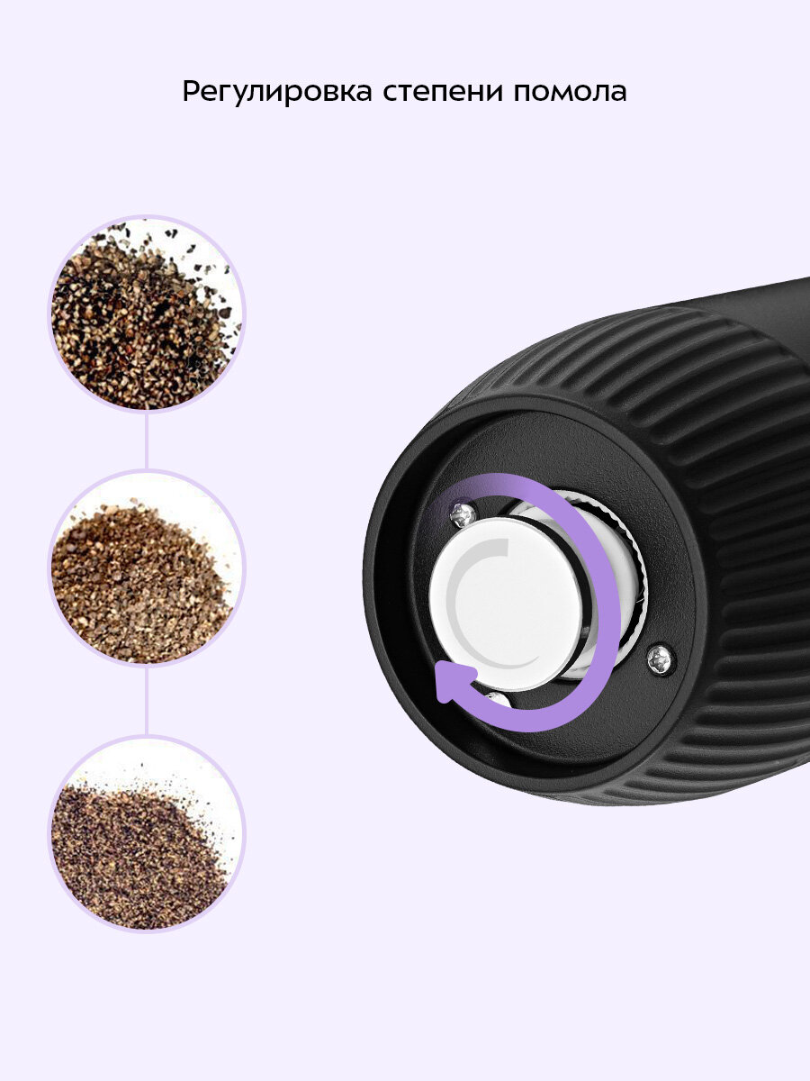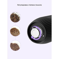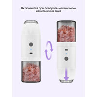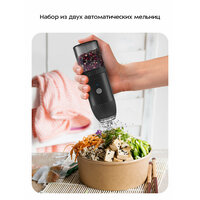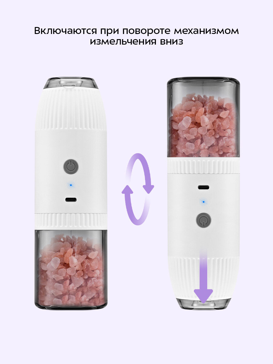 Добавит насыщенность вкусу! Набор мельниц на подставке Kitfort KT-6489 измельчает перец-горошек, соль и другие сухие специи. В отличие от специй, которые хранятся в уже измельчённом виде, свежемолотые специи имеют более яркий и насыщенный вкус и аромат. Переворот вкуса – в одно движение Автоматическая мельница имеет простое управление: устройство начинает работать, когда вы переворачиваете его механизмом измельчения вниз. Просто поместите устройство над блюдом и переверните – мельница автоматически начнёт молоть специи. От деликатного до грубого помола Настроить степень помола легко! Поворачивайте винт регулировки размера помола по часовой стрелке для уменьшения степени помола и против часовой стрелки – для увеличения степени помола. Удобная подсветка Мельницы оснащены встроенной подсветкой, включающейся при помоле. Это позволяет точно контролировать количество измельчённых специй, а также делает использование прибора более комфортным, особенно при недостаточной освещённости на кухне. Простая конструкция Широкое горлышко контейнера и разборная конструкция обеспечивают удобное заполнение мельницы перцем, морской солью, кориандром или другими сухими специями. Ёмкость каждого контейнера 120 мл. Работает от аккумулятора Устройство работает от аккумулятора, время работы составляет 30–40 минут. Для зарядки подходит шнур USB Type-C из комплекта. Мельницу можно зарядить любым способом: от сети, ноутбука или пауэрбанка. Время зарядки аккумулятора составляет 2 часа.
