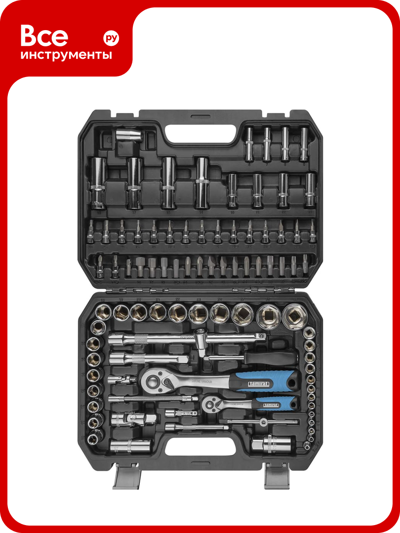Все инструменты для авто выполнены из высококачественной инструментальной стали, не подвержены коррозии и окислению. Кейс для инструментов – ударопрочный, с надежными металлическими защелками и усиленными петлями, на ложемент нанесены типоразмеры для того, чтобы удобно расположить набор торцевых головок, биты, трещотки, карданные шарниры, удлинители и т. д. В наборе инструментов для автомобиля – 2 трещотки на 24 зуба (1/2 и 1/4) с прорезиненной рукояткой, которые очень удобны при работе в ограниченном пространстве. Каждая трещотка для головок имеет механизм быстрого сброса, что позволяет легко и быстро менять насадки, реализована точная регулировка в обоих направлениях. На головки нанесены насечки, что способствует свободному вращению.