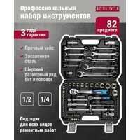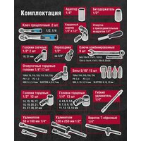 Набор инструментов для автомобиля в чемодане включает: торцевые головки 1/2" (12 шт): 14-21, 24, 27, 30, 32 мм; торцевые головки 1/4" (13 шт): 4, 4.5, 5, 5.5, 6-14 мм; отверточные торцевые головки 1/4" ( 17 шт): TORX: T8, T10, T15, T20, T25, T30; PH: 1,2 ; PZ 1,2 ; HEX: 3, 4, 5, 6 мм ; SLOTTED: 4, 5.5, 7 мм ; биты 5/16" (15 шт): HEX: 8, 10, 12, 14 мм , TORX: Т40 , T45 , Т50 , Т55 , PH: 3, 4 ; PZ 3, 4 ; SLOTTED: 8, 10, 12 мм ; ключи комбинированные (9 шт): 8×8, 10×10, 11×11, 12×12, 13×13, 14×14, 17×17, 19×19, 22×22; свечные головки 1/2" ( 2 шт): 16, 21 мм ; адаптер 1/4" ; битодержатель 1/2" ; переходник 1/2" на 3/8" ; карданный шарнир 1/4" ; карданный шарнир 1/2" , ключ трещоточный с быстрым сбросом 1/4" ; ключ трещоточный с быстрым сбросом 1/2" ; отвертка с присоединительным квадратом 1/4" ; удлинители 50 и 100 мм 1/4" ; удлинитель 120 мм 1/2" ; удлинитель 250 мм 1/2" , гибкий удлинитель 1/4" ; вороток Т-образный 1/4" . Всего набор автомобильных инструментов включает 82 предмета.
