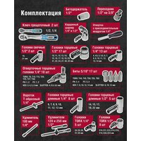 Набор инструментов для автомобиля в чемодане включает: торцевые головки 1/2" (17 шт): 10-22, 24, 27, 30, 32 мм ; головки торцевые длинные 1/2" (5 шт): 14, 15, 17, 19, 22 мм ; торцевые головки 1/4" (13 шт): 4, 4.5, 5, 5.5, 6-14 мм, головки торцевые длинные 1/4" (8 шт): 6-13 мм; отверточные торцевые головки 1/4" ( 18 шт): TORX: T8, T10, T15, T20, T25, T27, T30; PH: 1,2 ; PZ 1,2 ; HEX: 3, 4, 5, 6 мм ; SLOTTED: 4, 5.5, 6.5 мм ; Головки TORX 1/4" (5 шт): E4, E5, E6, E7, E8; биты 5/16" (17 шт): HEX: 7, 8, 10, 12, 14 мм , TORX: Т40 , T45 , Т50 , Т55 , T 60, PH: 3, 4 ; PZ 3, 4 ; SLOTTED: 8, 10, 12 мм ; головки TORX 1/2" (8 шт) Е10, Е11, Е12, Е14, Е16, Е18, Е20, Е24; свечные головки 1/2" ( 2 шт): 16, 21 мм ; битодержатель 1/2" ; переходник 1/2" на 3/8" ; карданный шарнир 1/4" ; карданный шарнир 1/2" , ключ трещоточный с быстрым сбросом 1/4" ; ключ трещоточный с быстрым сбросом 1/2" ; ключи шестигранные ( 4 шт ): 1.27 , 1.5 , 2 , 2.5 мм ; отвертка с присоединительным квадратом 1/4" ; удлинитель 100 мм 1/4" ; удлинитель 125 мм 1/2" ; удлинитель 250 мм 1/2"; вороток Т-образный 1/4" . Всего набор автомобильных инструментов включает 108 предметов.