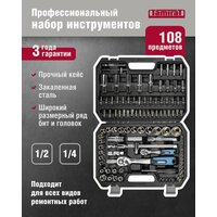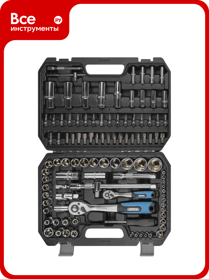 Набор инструментов для автомобиля в чемодане включает: торцевые головки 1/2" (17 шт): 10-22, 24, 27, 30, 32 мм ; головки торцевые длинные 1/2" (5 шт): 14, 15, 17, 19, 22 мм ; торцевые головки 1/4" (13 шт): 4, 4.5, 5, 5.5, 6-14 мм, головки торцевые длинные 1/4" (8 шт): 6-13 мм; отверточные торцевые головки 1/4" ( 18 шт): TORX: T8, T10, T15, T20, T25, T27, T30; PH: 1,2 ; PZ 1,2 ; HEX: 3, 4, 5, 6 мм ; SLOTTED: 4, 5.5, 6.5 мм ; Головки TORX 1/4" (5 шт): E4, E5, E6, E7, E8; биты 5/16" (17 шт): HEX: 7, 8, 10, 12, 14 мм , TORX: Т40 , T45 , Т50 , Т55 , T 60, PH: 3, 4 ; PZ 3, 4 ; SLOTTED: 8, 10, 12 мм ; головки TORX 1/2" (8 шт) Е10, Е11, Е12, Е14, Е16, Е18, Е20, Е24; свечные головки 1/2" ( 2 шт): 16, 21 мм ; битодержатель 1/2" ; переходник 1/2" на 3/8" ; карданный шарнир 1/4" ; карданный шарнир 1/2" , ключ трещоточный с быстрым сбросом 1/4" ; ключ трещоточный с быстрым сбросом 1/2" ; ключи шестигранные ( 4 шт ): 1.27 , 1.5 , 2 , 2.5 мм ; отвертка с присоединительным квадратом 1/4" ; удлинитель 100 мм 1/4"; удлинитель 125 мм 1/2" ; удлинитель 250 мм 1/2"; вороток Т-образный 1/4" . Всего набор автомобильных инструментов включает 108 предметов.