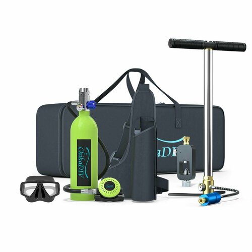 CHIKADIV C400 1L мини баллон для подводного плавания (регулятор отделен от корпуса, вам нужно будет собрать их), один подводный адаптер, одна маска для подводного плавания, портативная сумка для подводного плавания, сумка для рук, руководство пользователя и некоторые запасные аксессуары